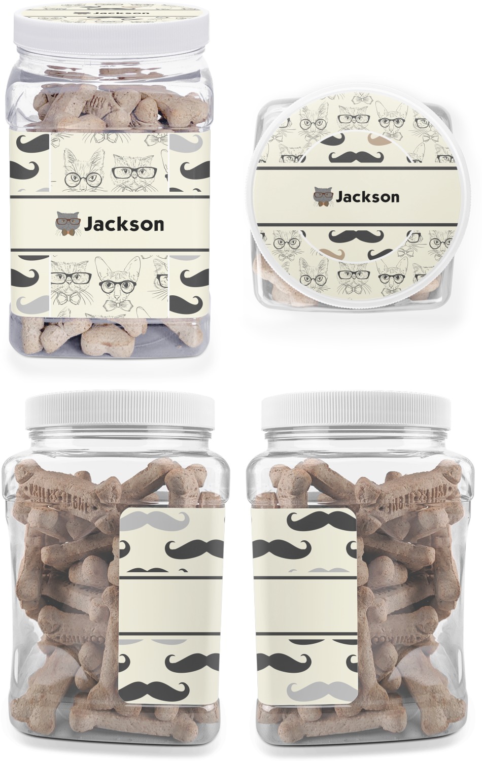 This half gallon jar, made from a sturdy plastic, is the perfect way to keep treats from any naughty pet paws, while still keeping them ready on hand for when your pup performs an impressive trick. This dog cookie jar features a screw-on, white lid that displays your personalized design on a vinyl sticker. We apply another customized sticker that wraps around the front and sides of the jar. Our dog treat jar also has indentations on the rear ends of the sides, which allows for convenient handling, and its square frame allows for easy storage.