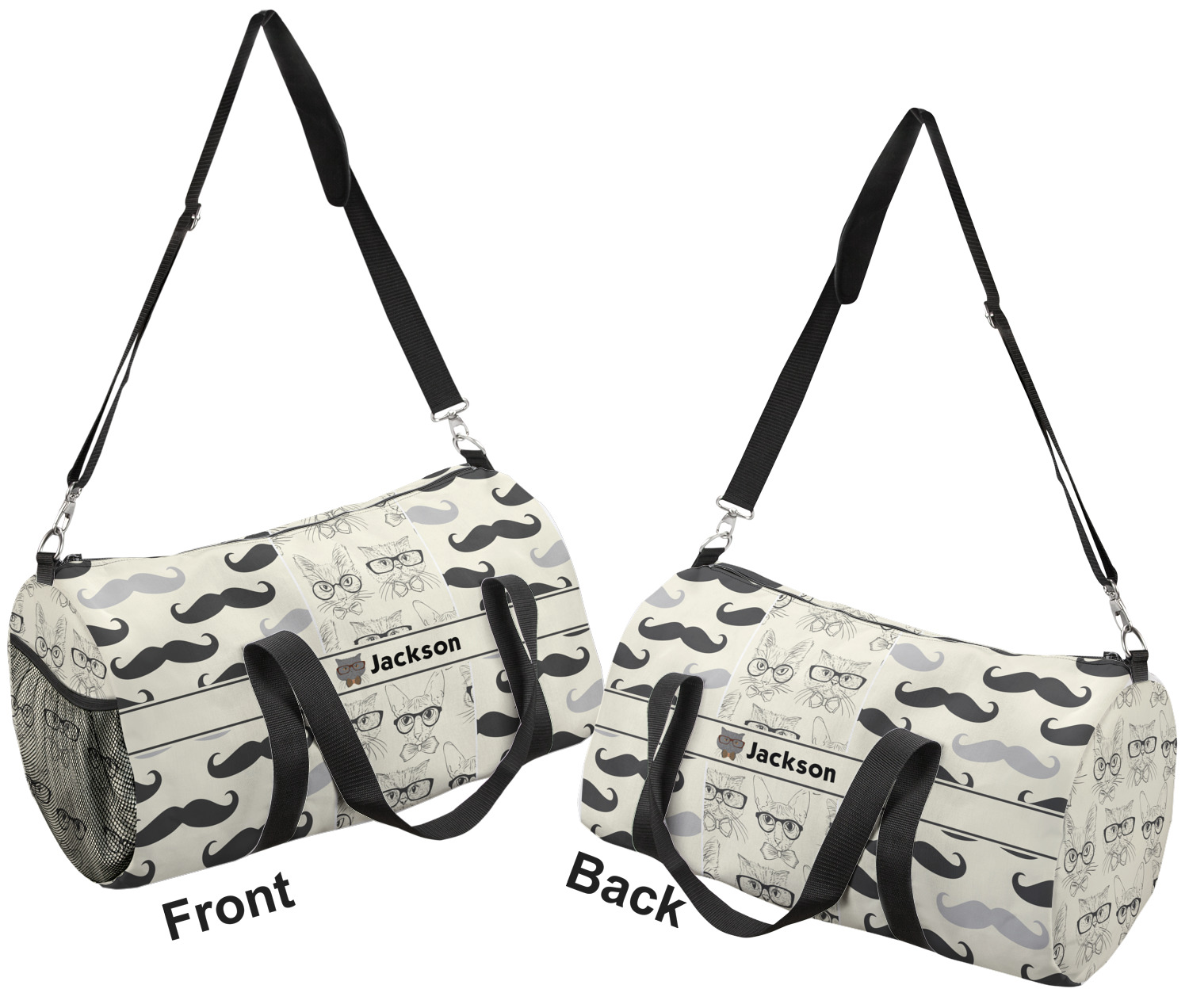This duffle is a sturdy bag made of a canvas material. It comes in two sizes: Small (19"W x 9.5"H x 9.5"D) and Large (23"W x 12"H x 12"D). The bag is a cylindrical shape with a black adjustable strap and two handles. On one side is an elastic pouch to put a waterbottle or other small item. Your product will be sublimated with your design and is able to be designed on the front, back, and sides. Be sure to remember that the straps may cut into parts of your design if you upload your own artwork.