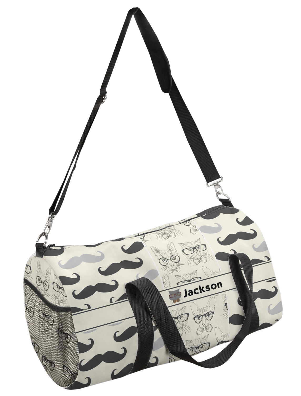 This duffle is a sturdy bag made of a canvas material. It comes in two sizes: Small (19"W x 9.5"H x 9.5"D) and Large (23"W x 12"H x 12"D). The bag is a cylindrical shape with a black adjustable strap and two handles. On one side is an elastic pouch to put a waterbottle or other small item. Your product will be sublimated with your design and is able to be designed on the front, back, and sides. Be sure to remember that the straps may cut into parts of your design if you upload your own artwork.