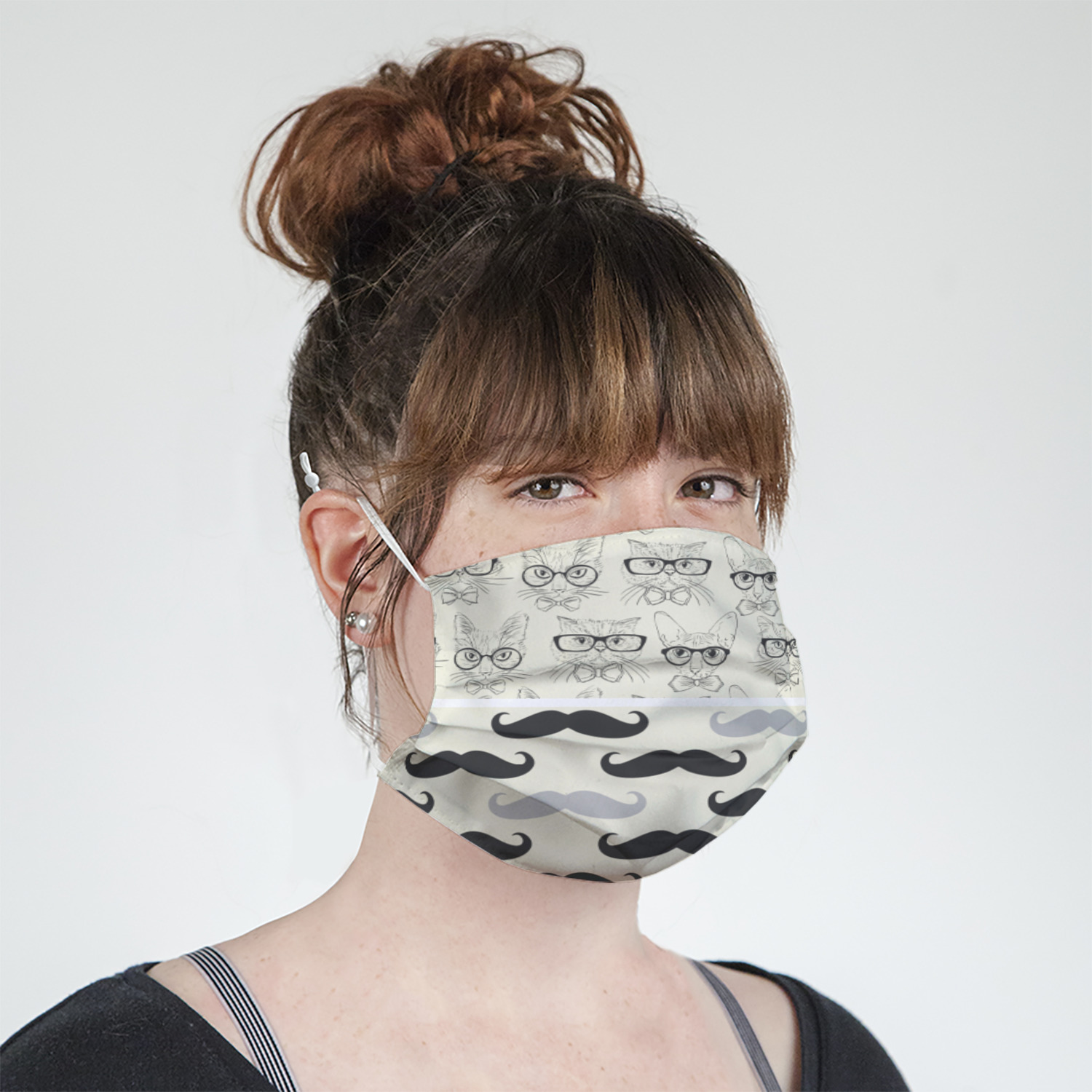 These fun face masks are 7" wide and 3.5" high. They feature pleats, adjustable ear loops, and are made with two layers of fabric. The top layer where your design is printed is a breathable polyester sheeting, while the inside layer is a soft microfiber polyester