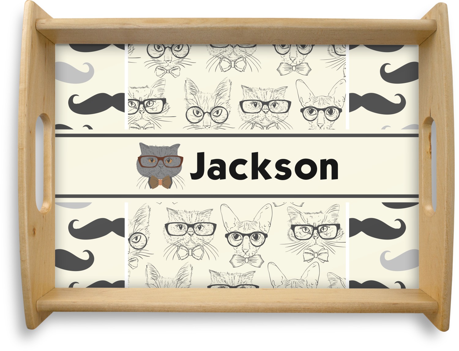 This serving tray with handles features square edges and two rounded sides, creating a very modern look. Each side is fabricated from a beautifully cut, natural wood. The bottom of the interior of the tray displays your customized design in bright, vibrant color. The tray is sold in both a black color and a natural wood look. Each variation of the wood serving tray has two sizes: Small, which is 14" x 10" x 2.25", and Large, which is 19.5" x 13.5" x 2.75".
