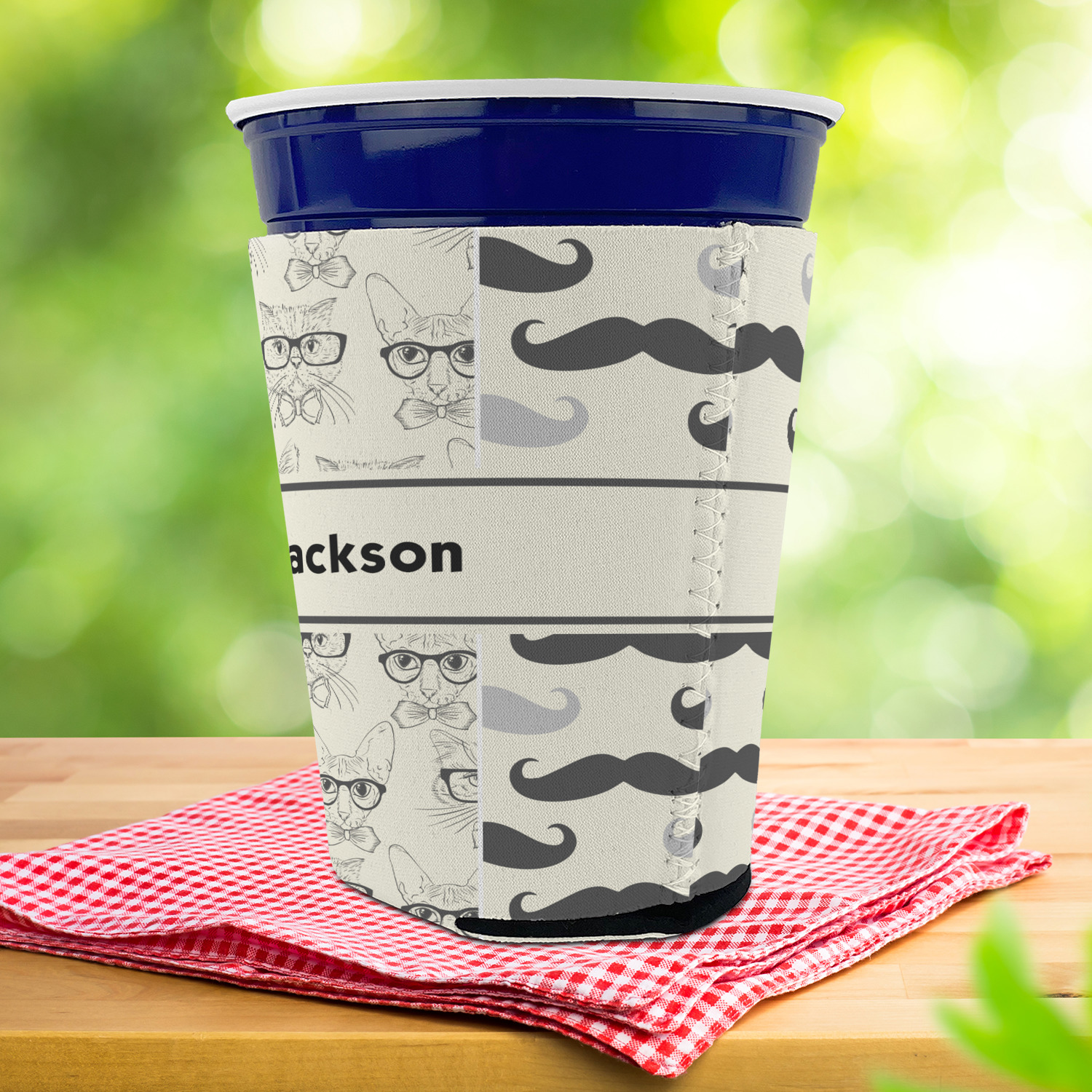 Made from neoprene with a polyester outer fabric and sewn seams, these premium quality party cup sleeves are very durable and will hold up to heavy use. They are available in 2 styles - with a bottom or just a sleeve to go around the outside of the tapered cup. The sleeve covers are about 4" tall and cover about 90% of the classic 16 oz. Solo cup.