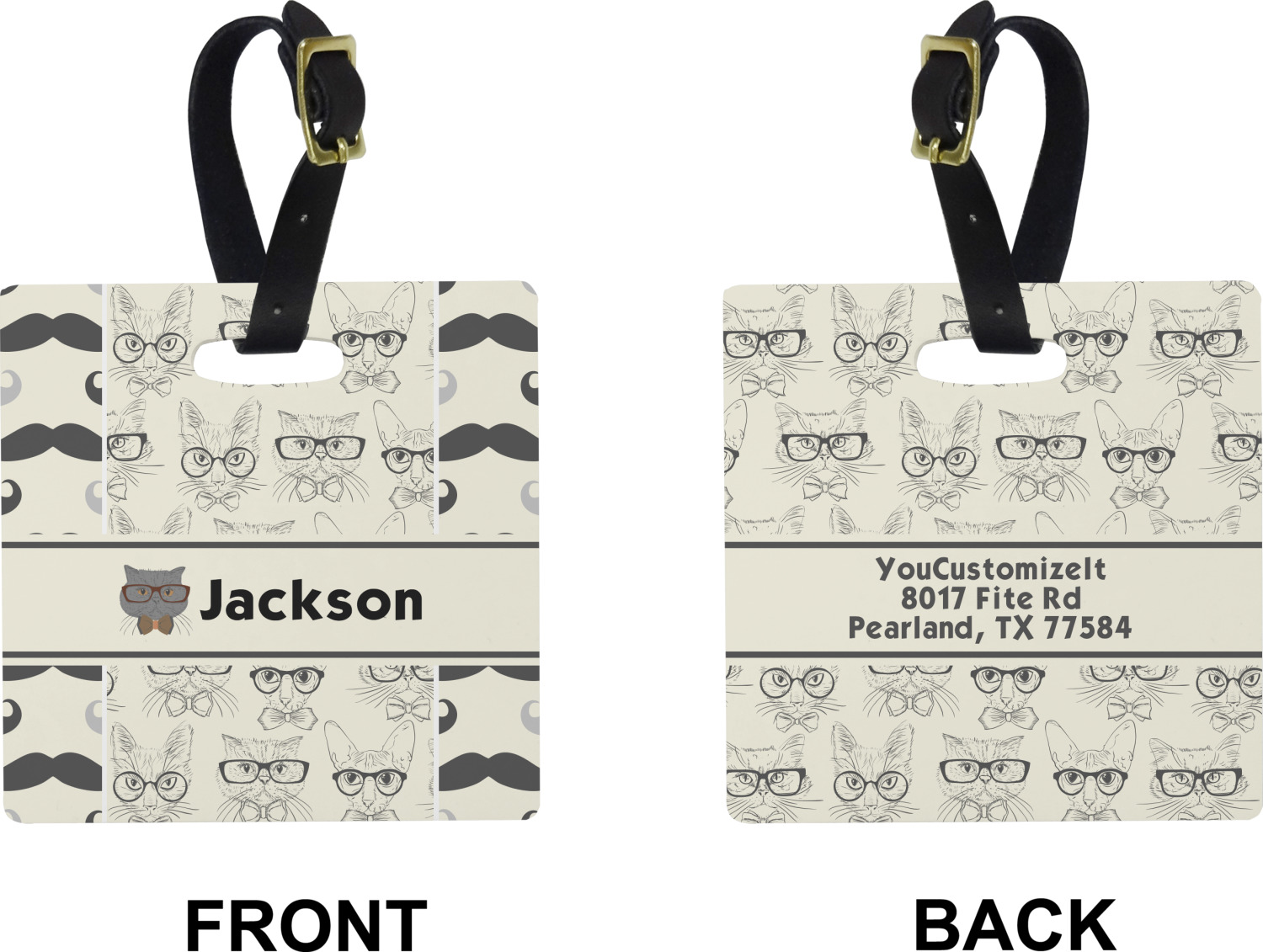 These personalized bag tags are sold in a variety of shapes, so that you may find the product that meets your vision exactly. We sell a round luggage tag, which measures at approximately 4" x 4". Our square luggage tag is about 3.5" x 3.5", while our rectangular version is 2.75" x 4 ".