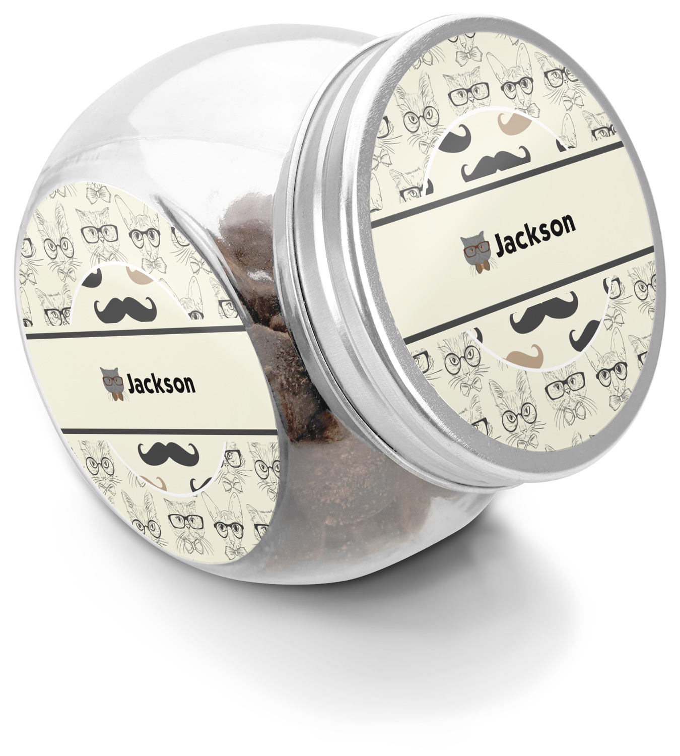This treat jar is an excellent way to store treats for your favorite canine or feline. Moreover, their delicate, classy appearance makes them a tasteful addition to your countertop's décor. Crafted from clear glass, its unique construction and silver metal, screw-on lid allows for quick and easy access. Three, permanent, vinyl stickers are applied to both sides of the jar and lid, presenting your personalized design. The base of this glass, dog treat jar is 3.4" x 4.75", and the jar stands at 5" tall. Though on the smaller side, this jar is best suited for smaller treats or training treats.