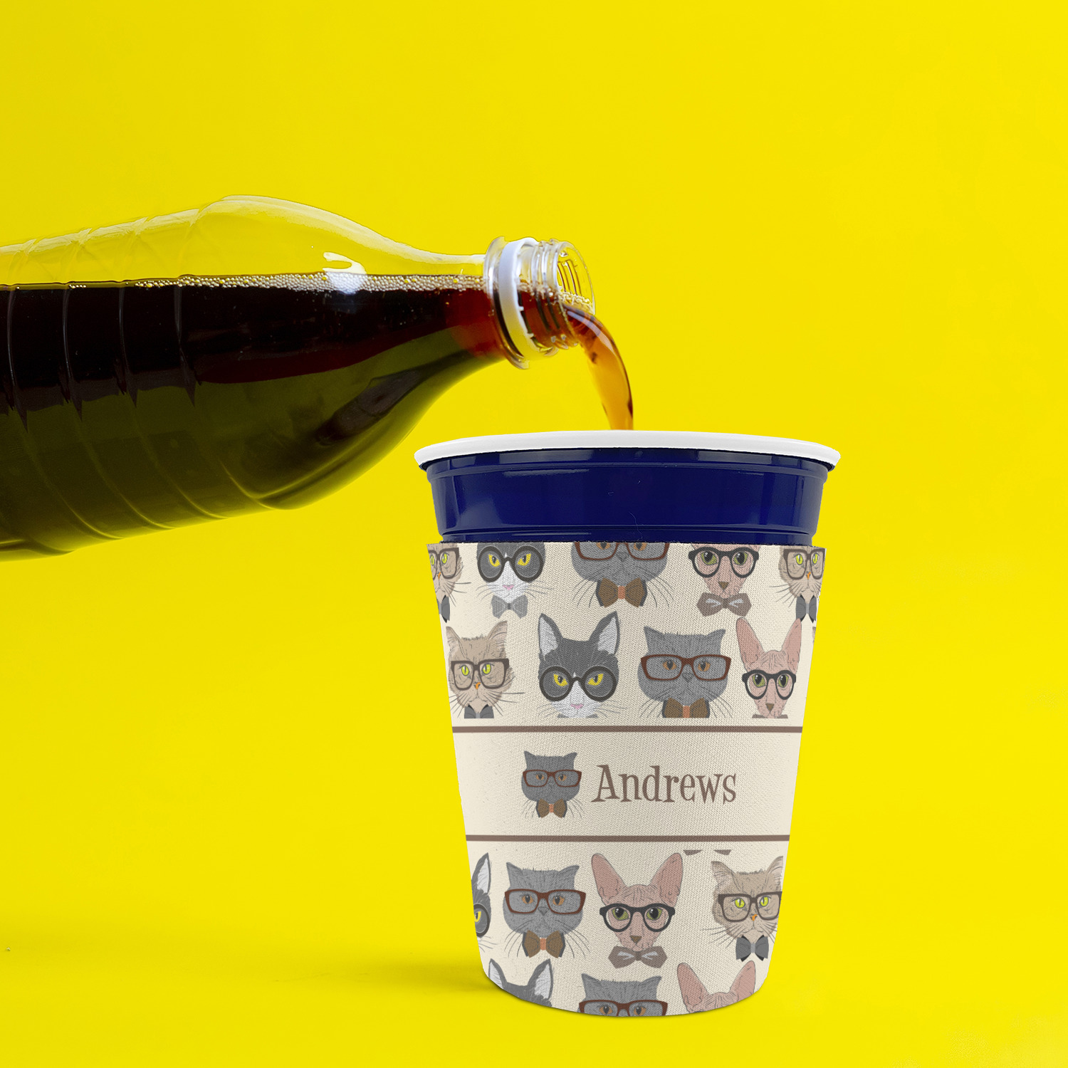 Made from neoprene with a polyester outer fabric and sewn seams, these premium quality party cup sleeves are very durable and will hold up to heavy use. They are available in 2 styles - with a bottom or just a sleeve to go around the outside of the tapered cup. The sleeve covers are about 4" tall and cover about 90% of the classic 16 oz. Solo cup.