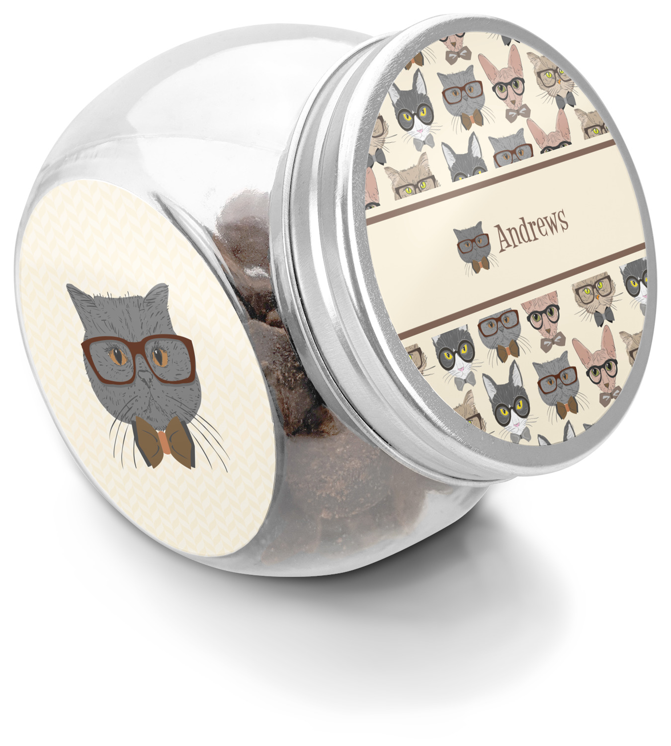 This treat jar is an excellent way to store treats for your favorite canine or feline. Moreover, their delicate, classy appearance makes them a tasteful addition to your countertop's décor. Crafted from clear glass, its unique construction and silver metal, screw-on lid allows for quick and easy access. Three, permanent, vinyl stickers are applied to both sides of the jar and lid, presenting your personalized design. The base of this glass, dog treat jar is 3.4" x 4.75", and the jar stands at 5" tall. Though on the smaller side, this jar is best suited for smaller treats or training treats.