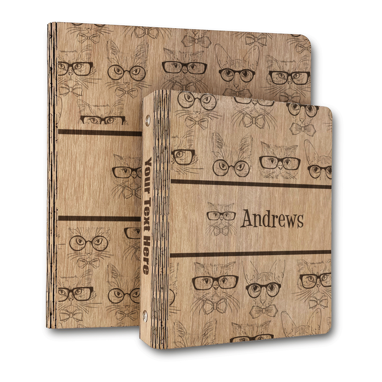Made from premium hardwood, these are laser engraved then polished with wax to give a nice sheen and smooth feel to the product. The inside of the binders are finished with a faux leather material which is bonded to the inside of the wood to strengthen the wood and give the inside the same refined finish. The rustic brown and gold leather material adds a nice classic touch to the binders.