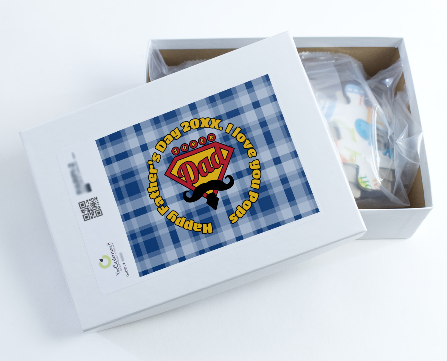 This design is perfect for the Hipster Dad. We chose a blue plaid background with a graphic & text personalization style. We chose the super dad graphic with a mustache & tie in traditional red and yellow. We added "Happy Father's Day 20XX. I Love You Pops" for our text. You can create the perfect father's day gift with this design!
