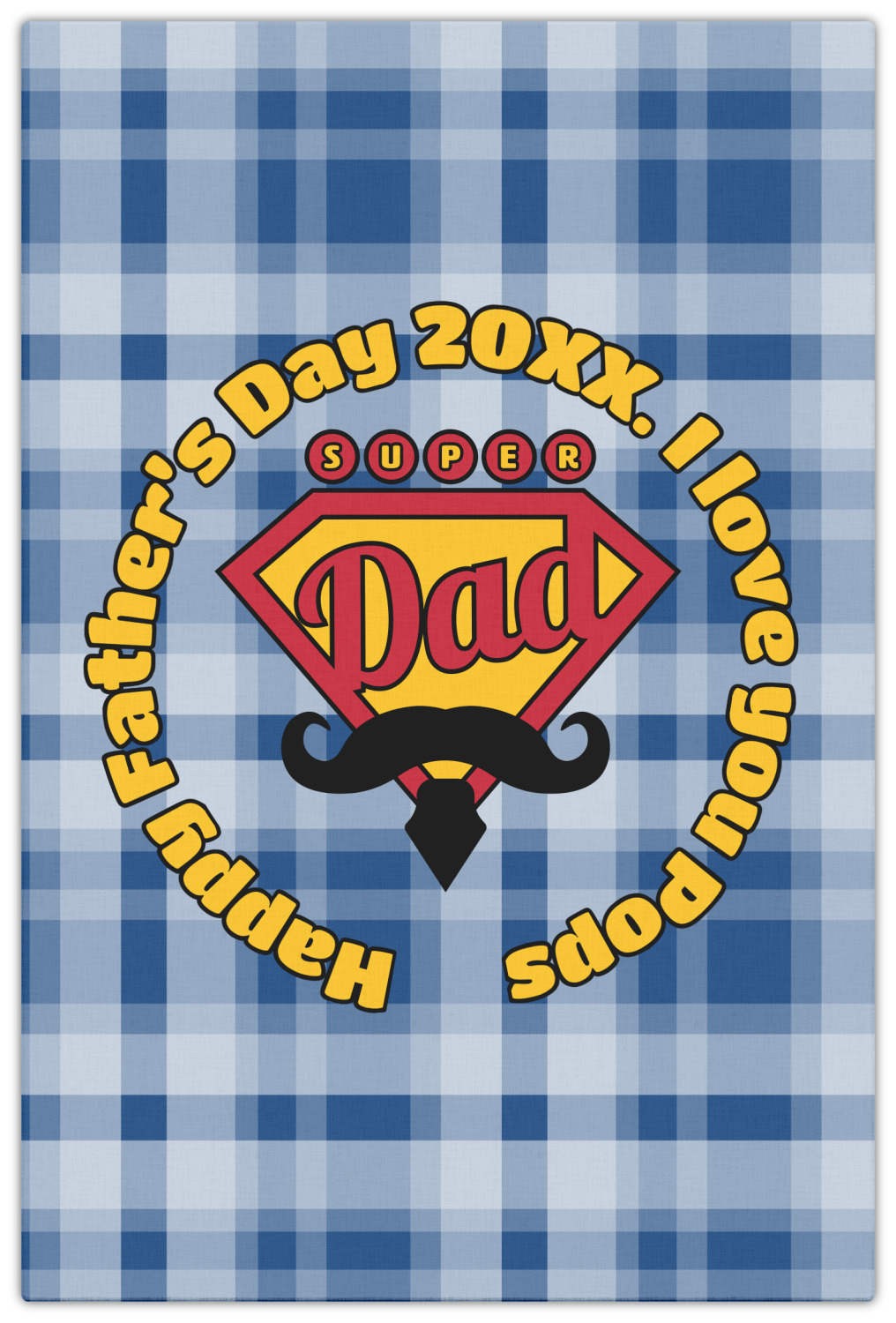 This design is perfect for the Hipster Dad. We chose a blue plaid background with a graphic & text personalization style. We chose the super dad graphic with a mustache & tie in traditional red and yellow. We added "Happy Father's Day 20XX. I Love You Pops" for our text. You can create the perfect father's day gift with this design!