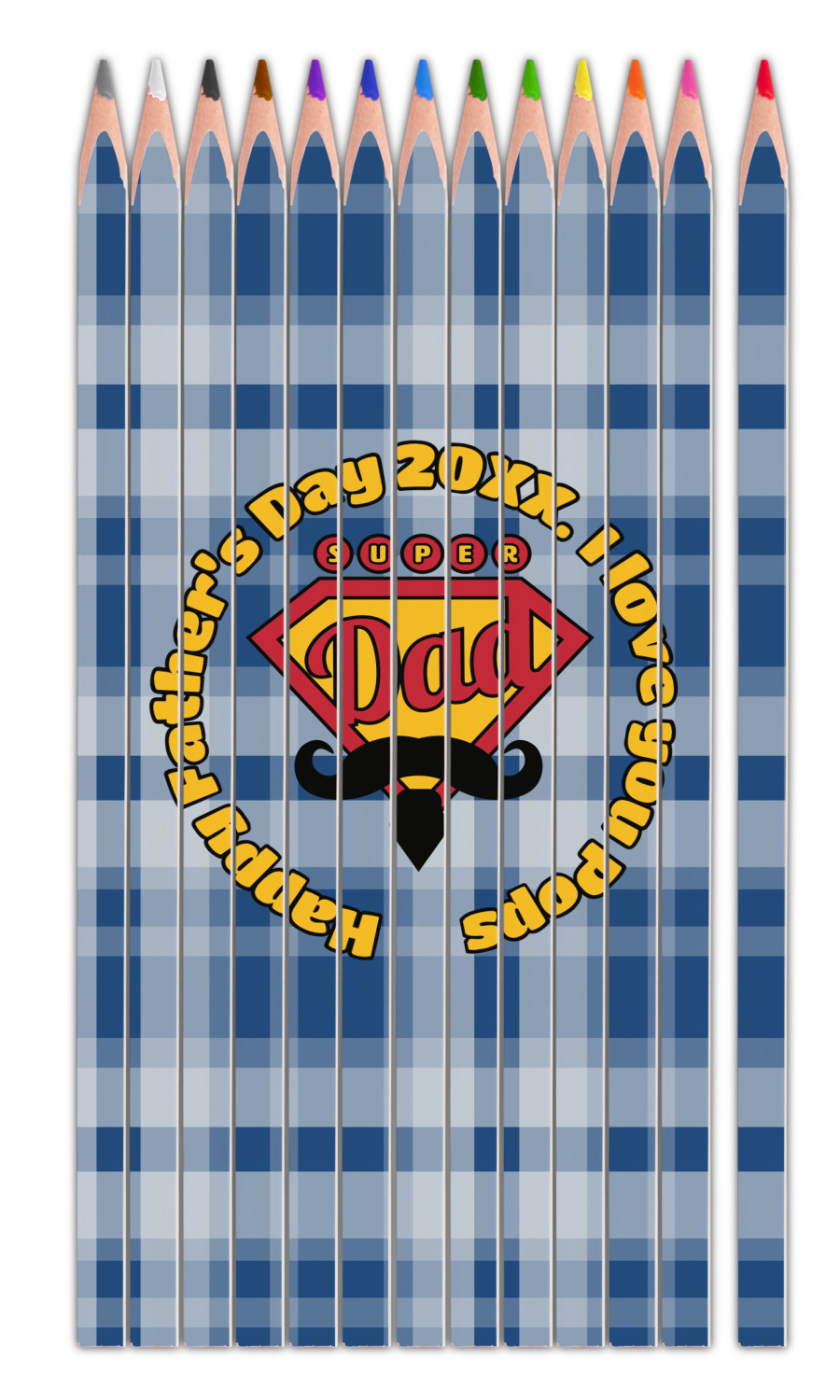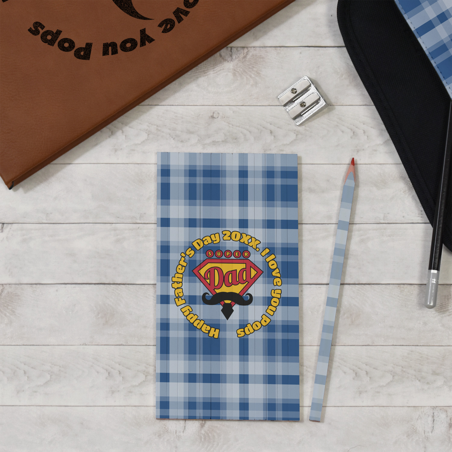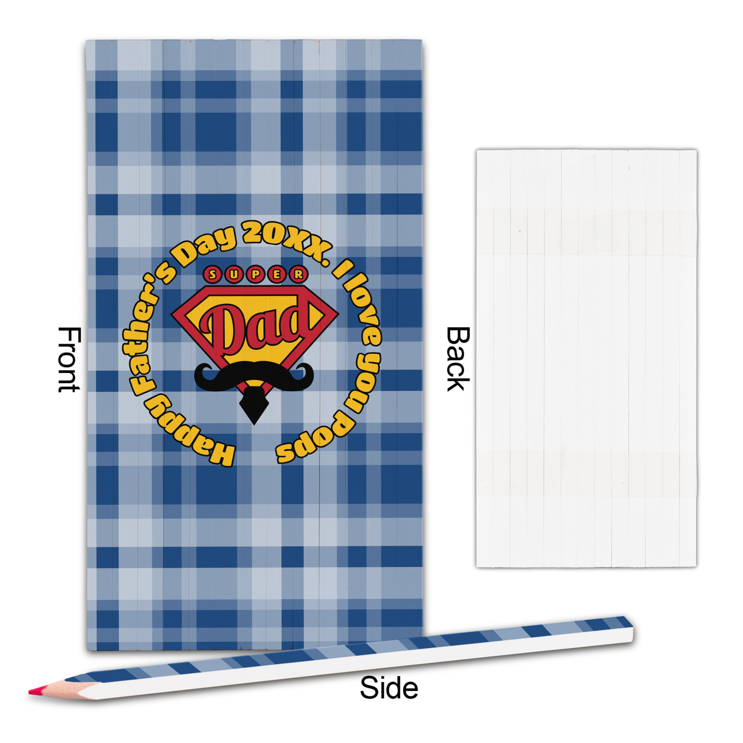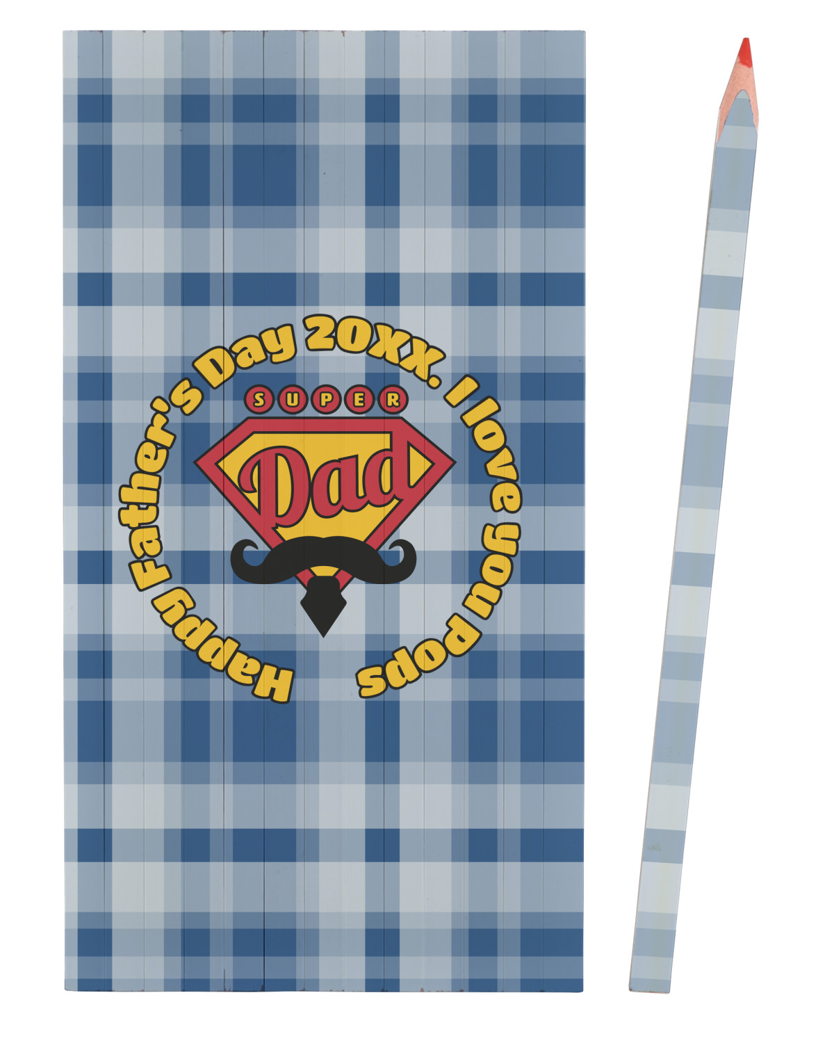 This design is perfect for the Hipster Dad. We chose a blue plaid background with a graphic & text personalization style. We chose the super dad graphic with a mustache & tie in traditional red and yellow. We added "Happy Father's Day 20XX. I Love You Pops" for our text. You can create the perfect father's day gift with this design!