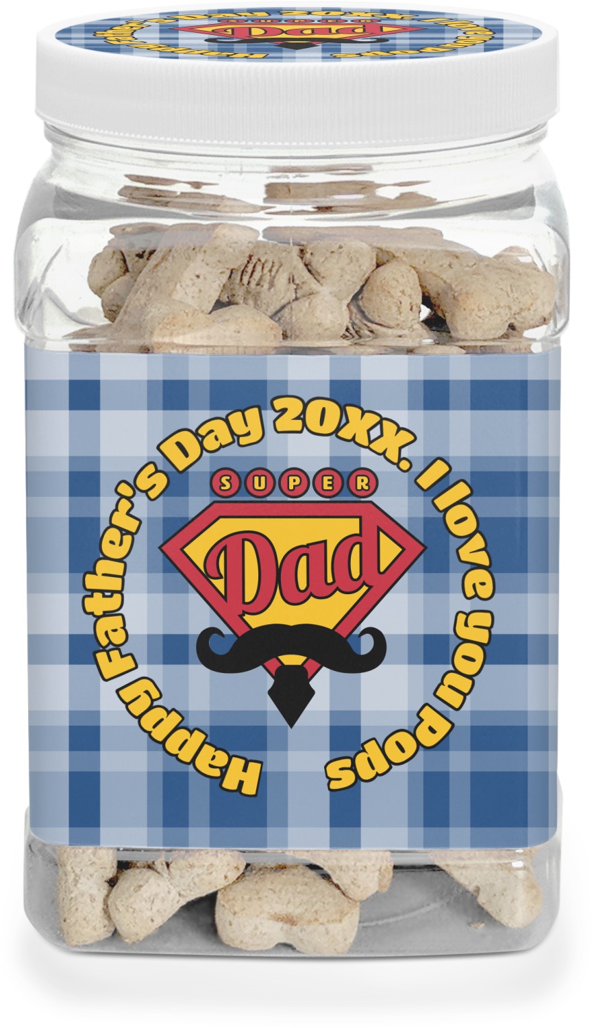 This half gallon jar, made from a sturdy plastic, is the perfect way to keep treats from any naughty pet paws, while still keeping them ready on hand for when your pup performs an impressive trick. This dog cookie jar features a screw-on, white lid that displays your personalized design on a vinyl sticker. We apply another customized sticker that wraps around the front and sides of the jar. Our dog treat jar also has indentations on the rear ends of the sides, which allows for convenient handling, and its square frame allows for easy storage.