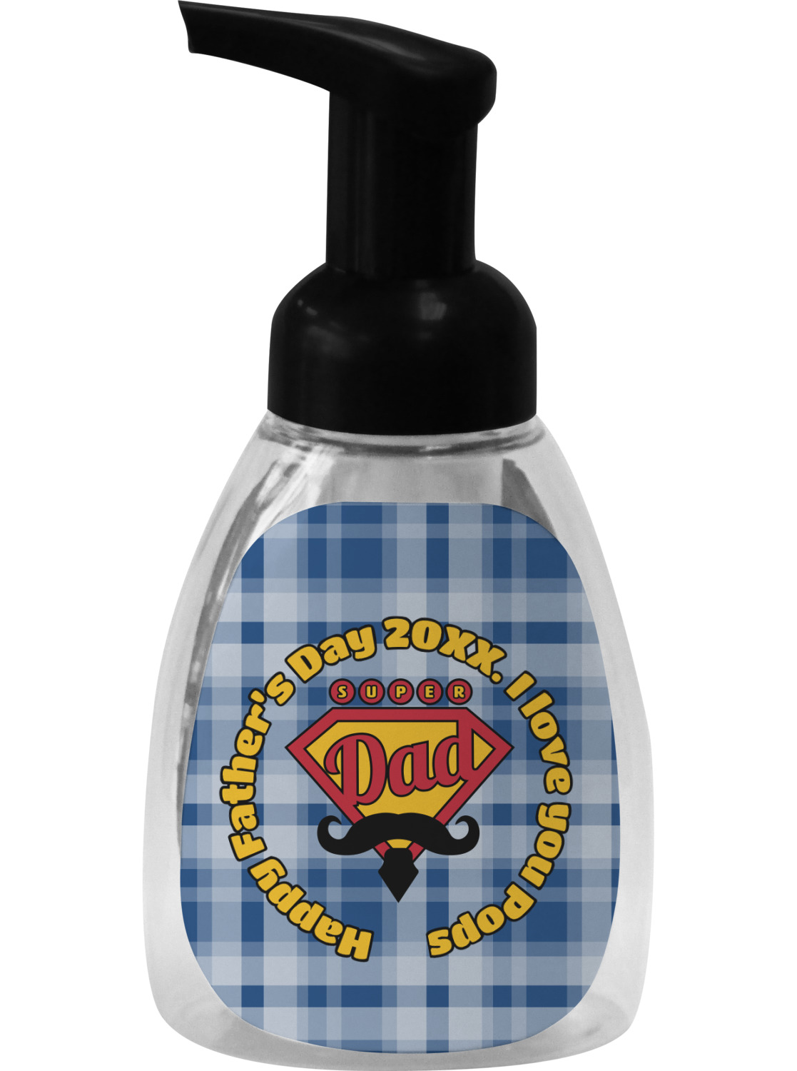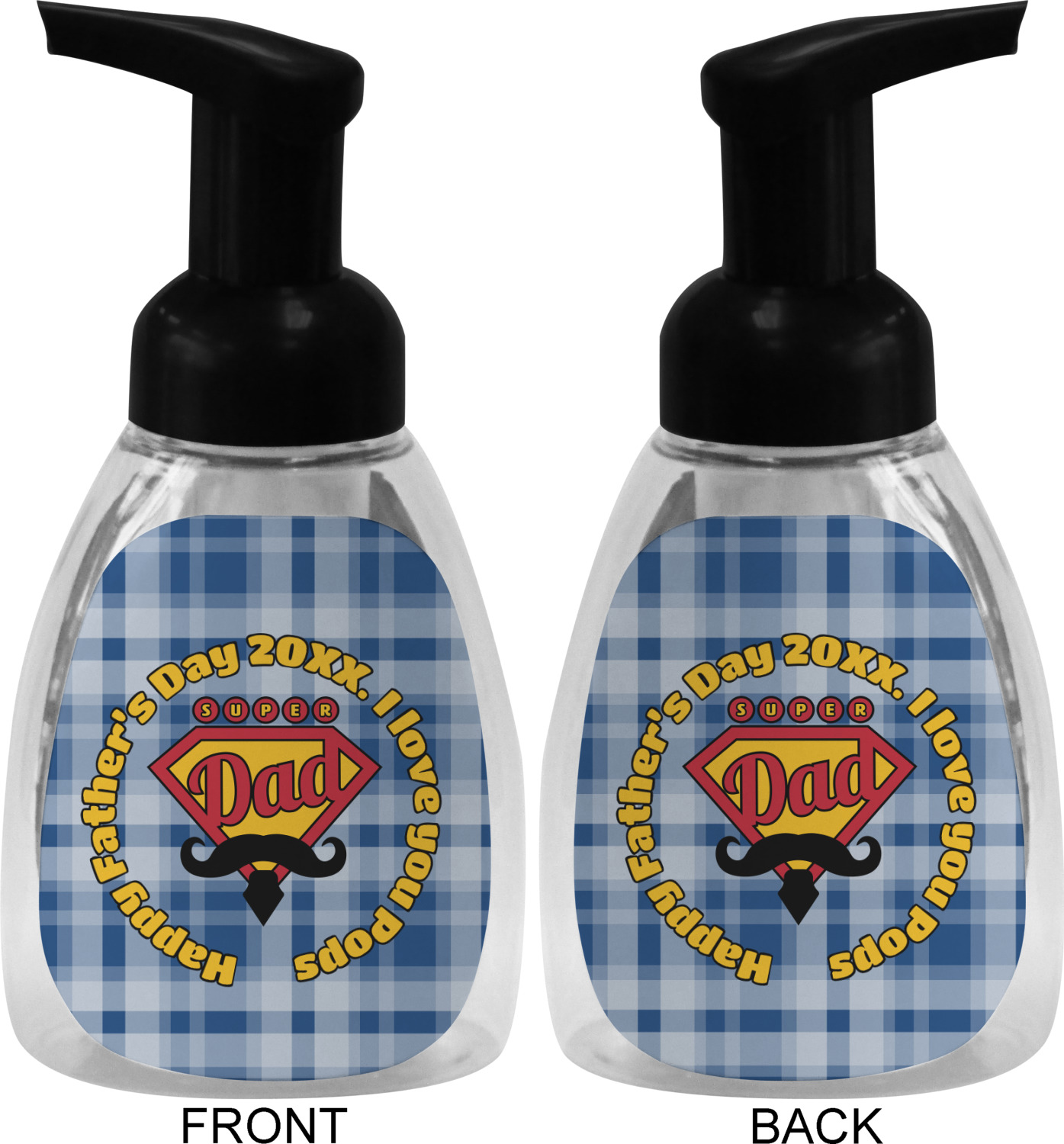 This soap dispenser is made of a robust plastic and has a clear base. The included soap pump is available in black or white color. This dispenser is 6.5 inches tall, 3 inches wide, and 2 inches deep. We display your customized designs on the front and back sides of these foaming hand soap dispensers.