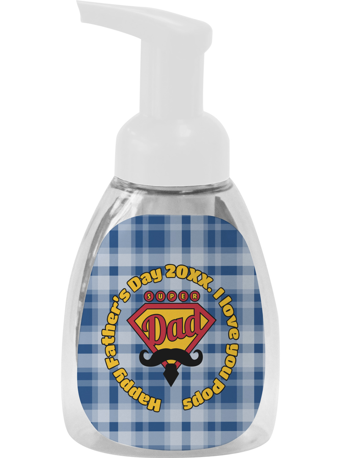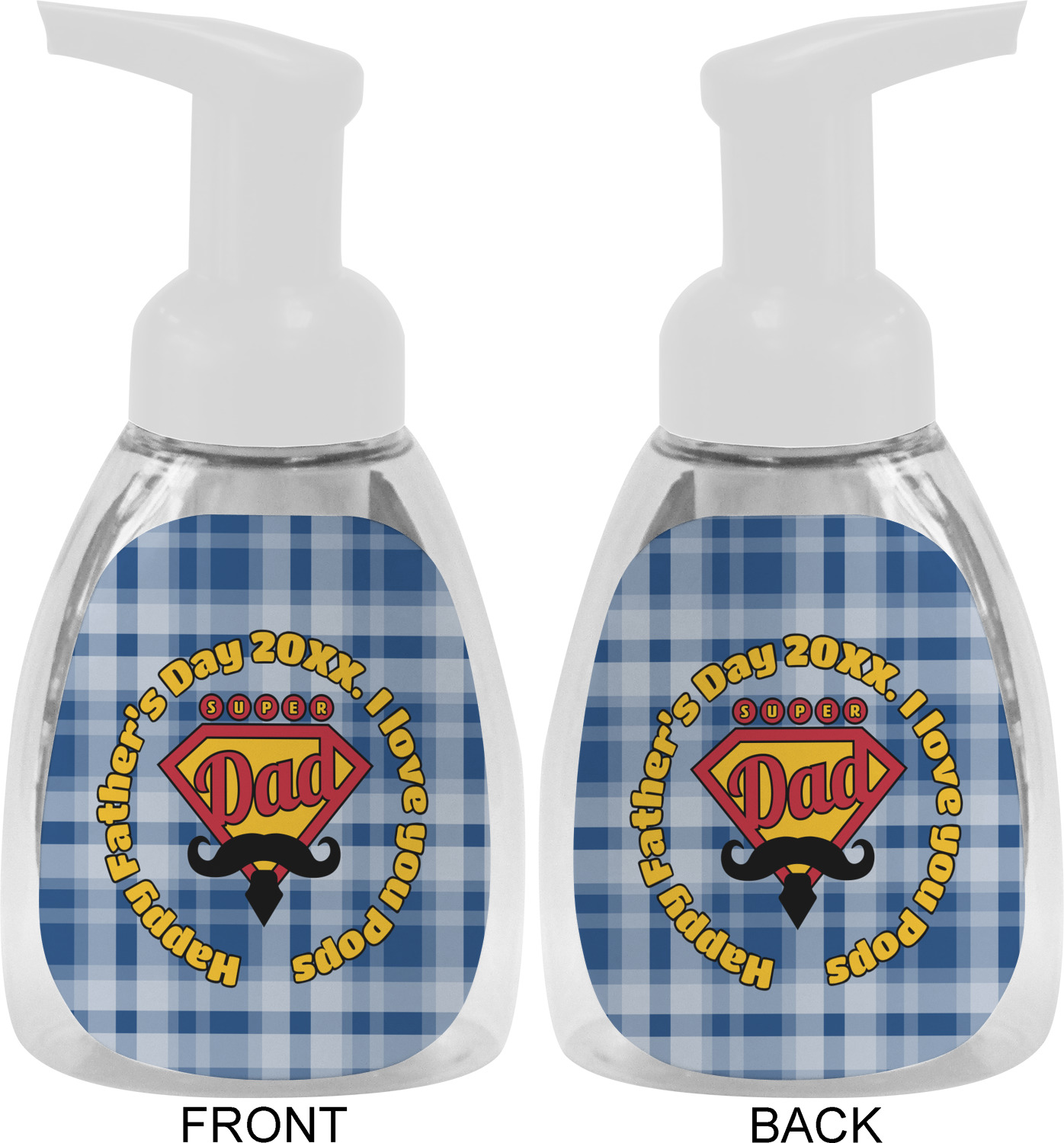 This soap dispenser is made of a robust plastic and has a clear base. The included soap pump is available in black or white color. This dispenser is 6.5 inches tall, 3 inches wide, and 2 inches deep. We display your customized designs on the front and back sides of these foaming hand soap dispensers.