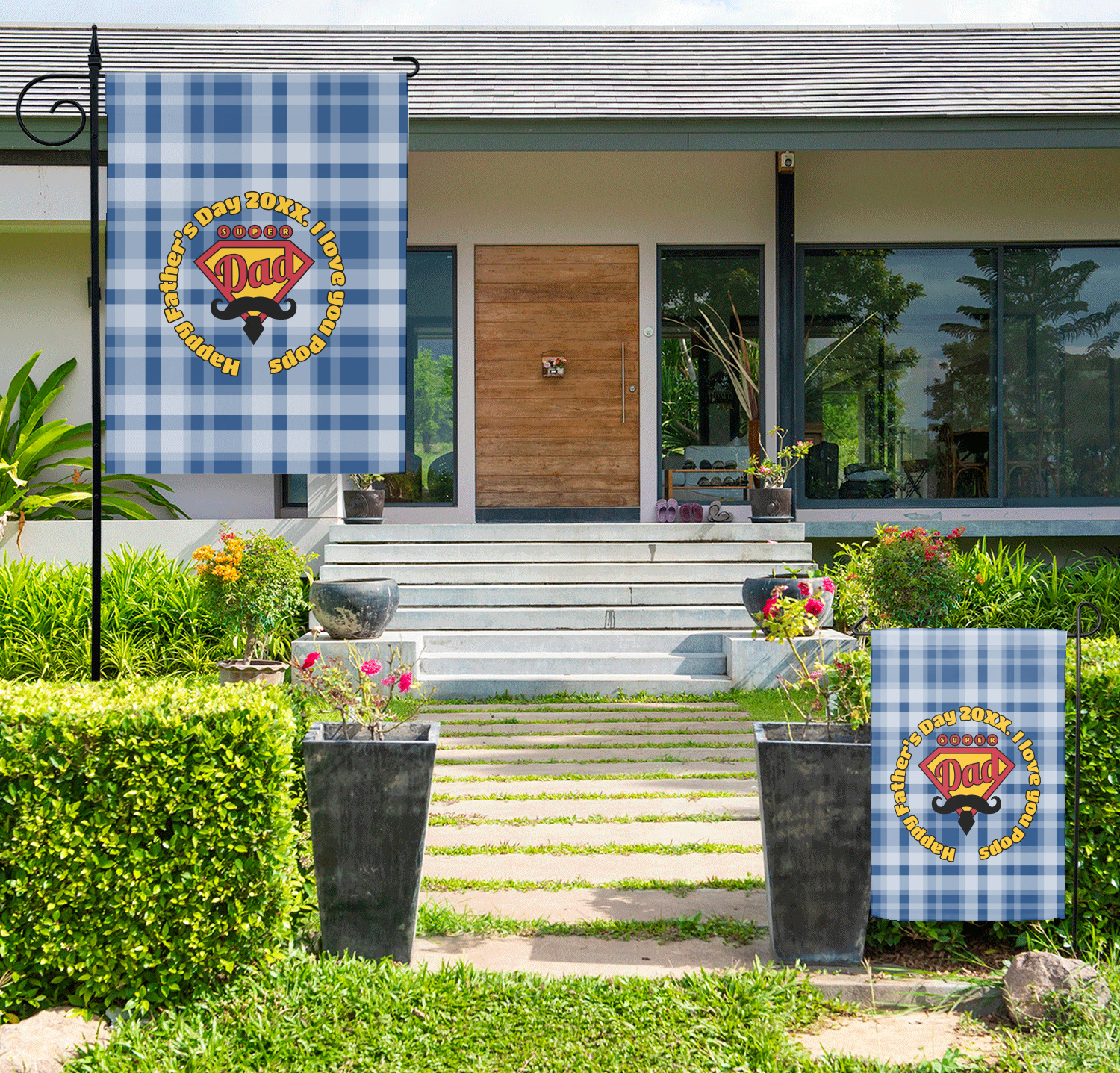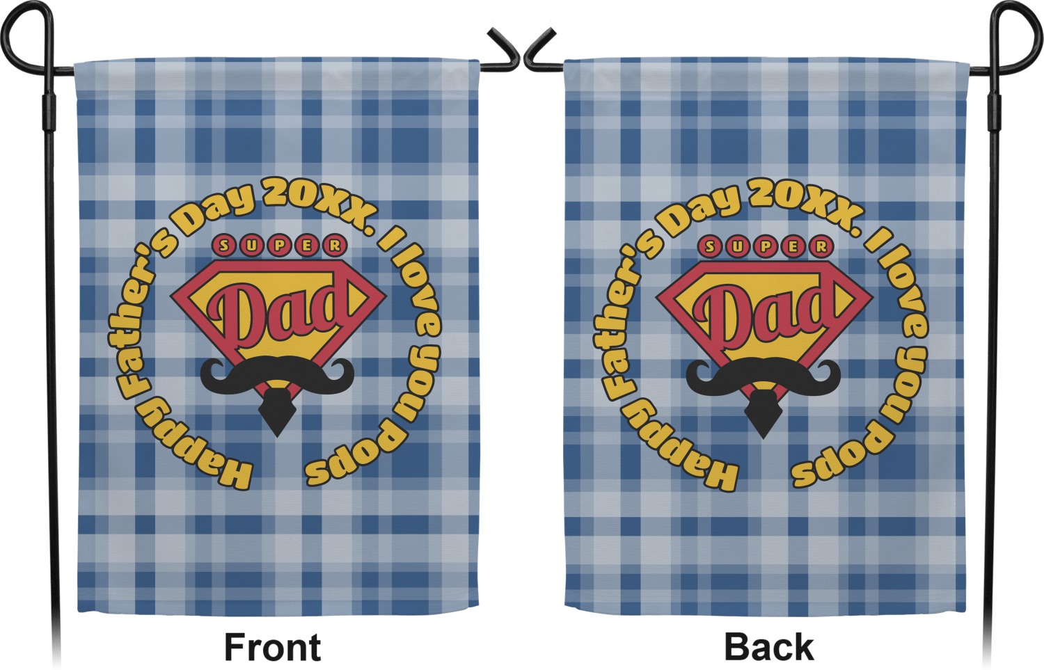 This design is perfect for the Hipster Dad. We chose a blue plaid background with a graphic & text personalization style. We chose the super dad graphic with a mustache & tie in traditional red and yellow. We added "Happy Father's Day 20XX. I Love You Pops" for our text. You can create the perfect father's day gift with this design!