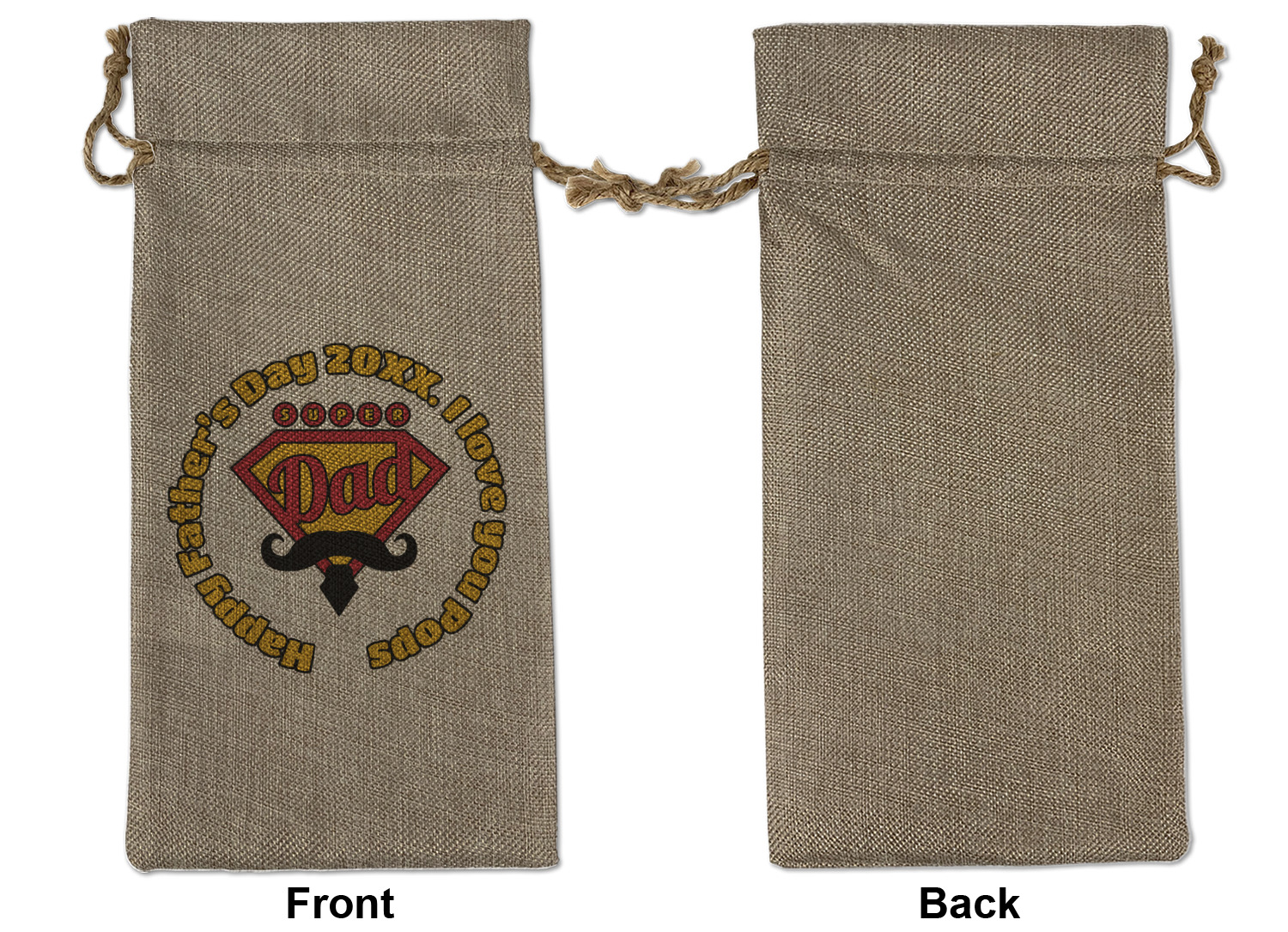 We sell our Burlap Gift Bags in 3 variant sized bags. Made with burlap polyester, each personalized bag can be secured with a twine drawstring pull. Your custom design is available to print on one side or both sides - completely up to you! The sizes of the bags measure approximately 4.5" x 6.5" for the smallest size, 6.5" x 8.0" for the medium size, and 6.5" x 13.5" for the large-sized bag.