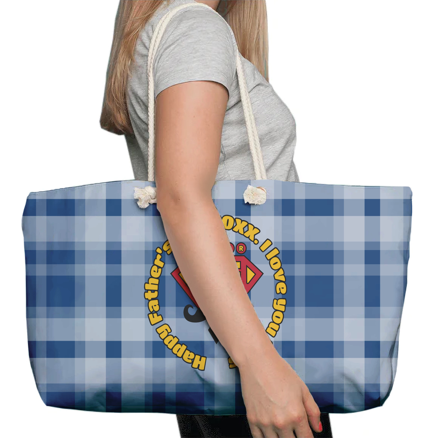Our oversized weekender tote with rope handles is perfect for your weekend at the beach or on the town. This large tote are 24" W X 13" H, with a 5" gusset and a 27" thick rope handles with a knot that is put through a grommeted brass hole.