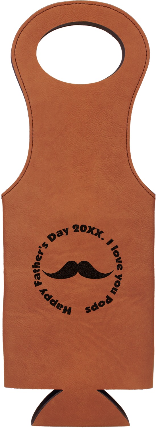 This wine carrier is made from a stunning leatherette, in a cognac-brown color. Strong, black stitching lines the sides of your wine bottle bag and provides extra durability. The interior is lined with a padded, black material to allow for a snug fit once your bottle is placed inside. At the top of this wine gift bag, you'll find two oval shaped handles that elegantly complements the rest of the bag's style. We provide you with the option of laser-engraving the front, or the front and back of your new personalized wine bag!