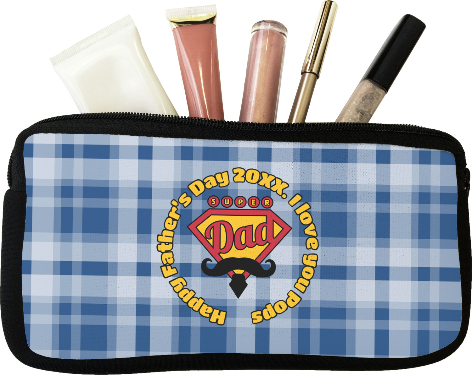 Our personalized makeup bags are available in many different designs, patterns and colors - so you are sure to find one that will love. They are made of neoprene (same material as wet-suits) and thus are water resistant, so spillages in your makeup bag will not end up all over you purse. They are customized on one side and are black on the other side and the zipper is black as well.