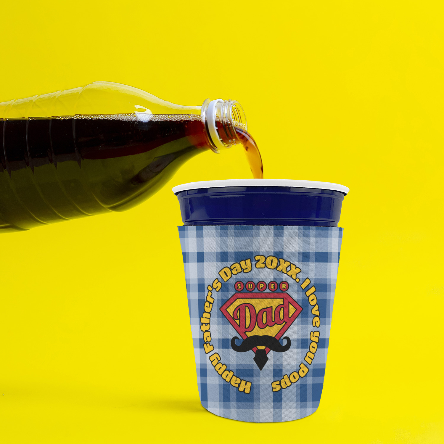 This design is perfect for the Hipster Dad. We chose a blue plaid background with a graphic & text personalization style. We chose the super dad graphic with a mustache & tie in traditional red and yellow. We added "Happy Father's Day 20XX. I Love You Pops" for our text. You can create the perfect father's day gift with this design!