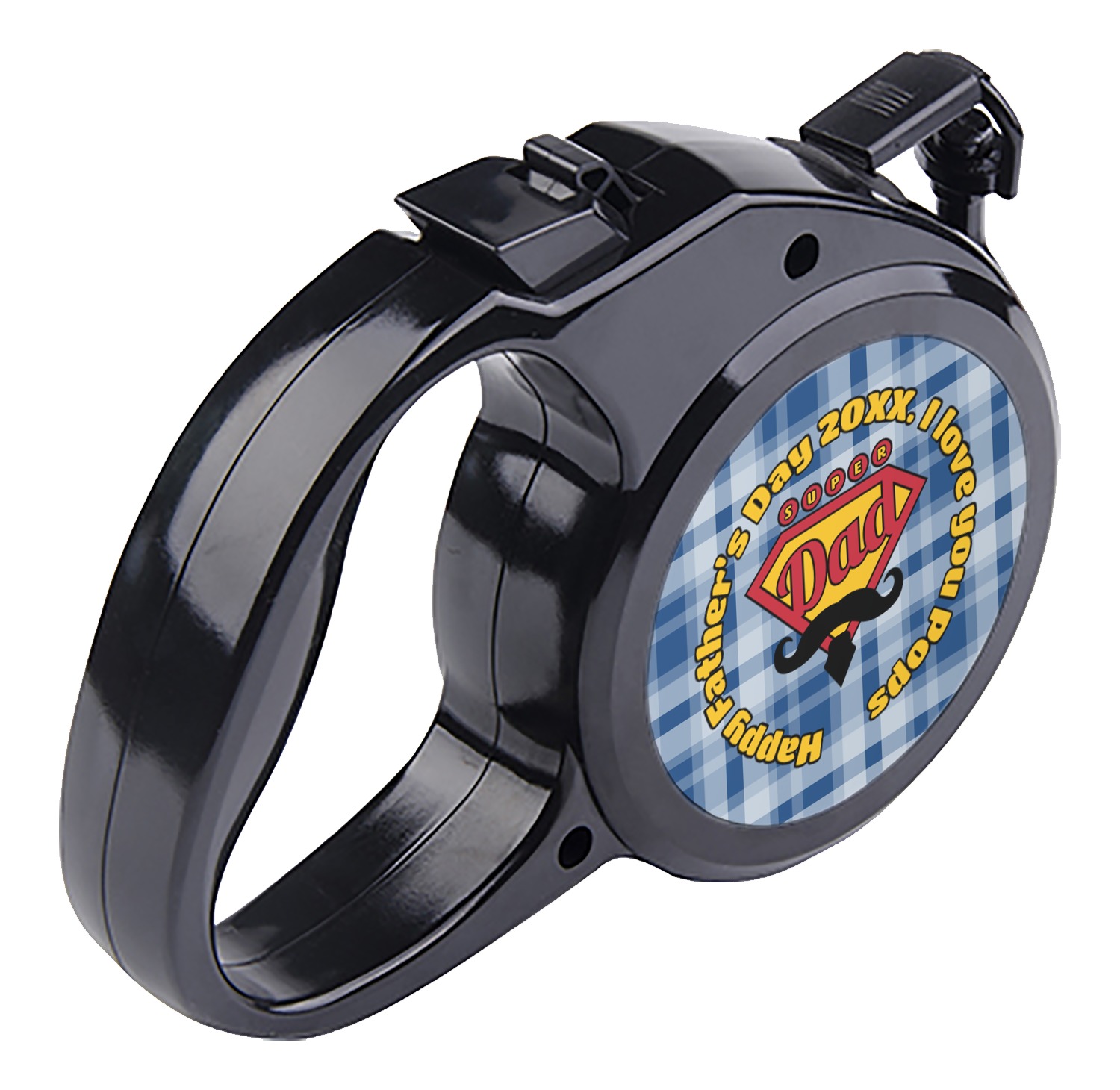 The leash's plastic handle is accommodating of your grip and displays your customization on both sides. The dog leash also features the traditional bolt snap clip, for easy fastening to your dog's collar. The leash and leash handle themselves are both black in color.