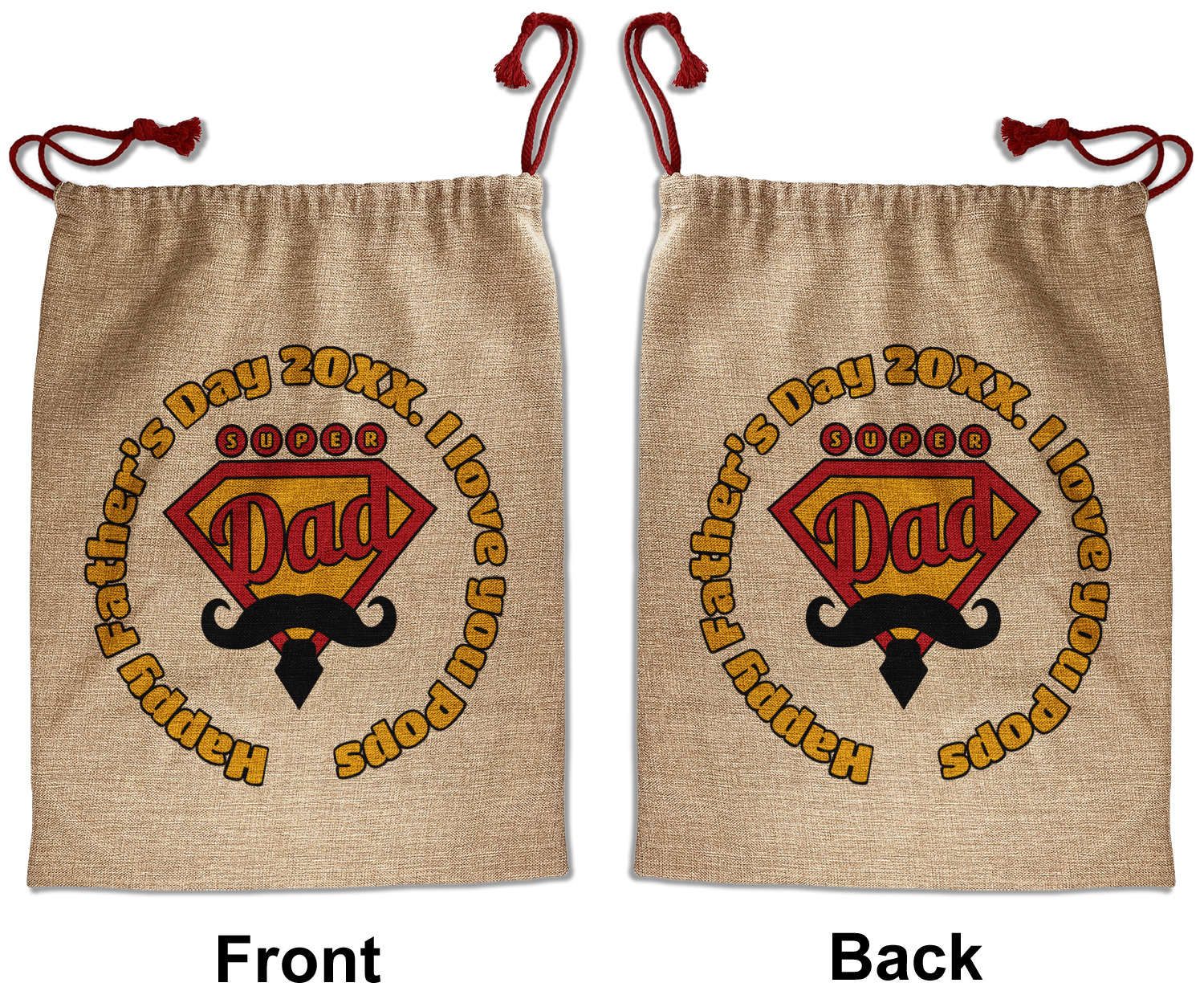 Our Santa sacks print your design on the burlap material giving it a nice rustic, natural design! The burlap material is also machine washable and wrinkle-free, so feel free to fold and store out Santa bags until the next time you need it! Secure your gifts with our red accent drawstring ties at the top of the sack so the mystery of your gift stays a surprise until Christmas day. We offer two types of printing- one side partial print or double-sided partial printing. Design and personalize your own Santa sack in time for the holidays!