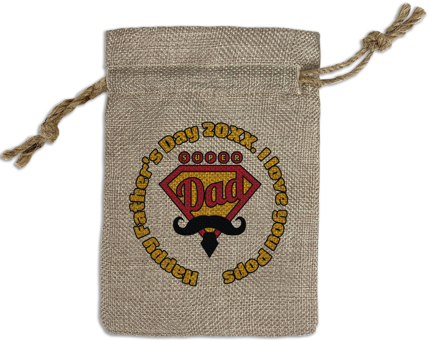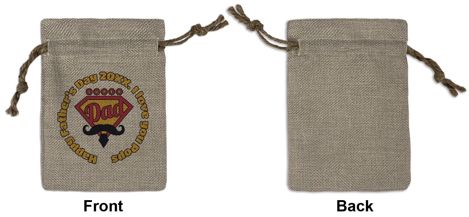We sell our Burlap Gift Bags in 3 variant sized bags. Made with burlap polyester, each personalized bag can be secured with a twine drawstring pull. Your custom design is available to print on one side or both sides - completely up to you! The sizes of the bags measure approximately 4.5" x 6.5" for the smallest size, 6.5" x 8.0" for the medium size, and 6.5" x 13.5" for the large-sized bag.