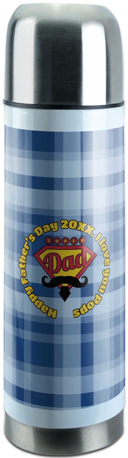 Manufactured from stainless steel, this thermos is built durably and double-walled insulated to preserve the temperature of your drink for hours. It also features a screw off lid that is made to also function as a small cup. Upon unscrewing this part of the thermos bottle, a pop-open, pour feature emerges. This feature allows you to slowly pour your beverage into your lid, ensuring a steady, controlled pour into your lid or other cup. With a capacity of 25 ounces, these large thermoses can hold several servings of your favorite beverage. Your customization is displayed all around the bottle with bright, vibrant color.