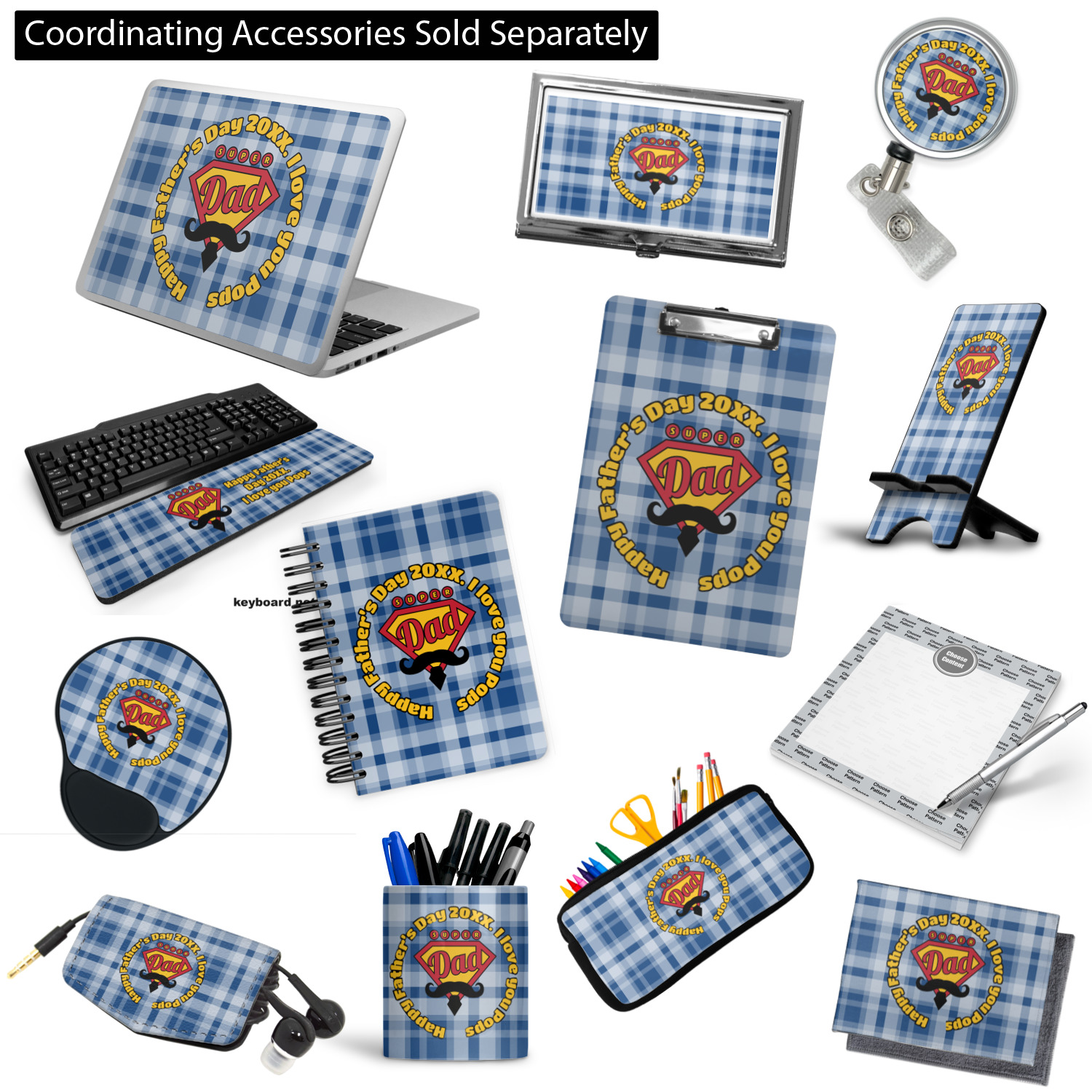 This design is perfect for the Hipster Dad. We chose a blue plaid background with a graphic & text personalization style. We chose the super dad graphic with a mustache & tie in traditional red and yellow. We added "Happy Father's Day 20XX. I Love You Pops" for our text. You can create the perfect father's day gift with this design!