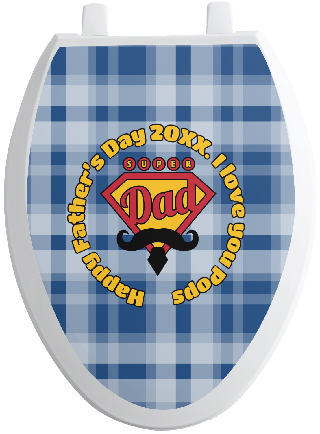 We sell these toilet lid decals in two different shapes to accommodate a wider range of toilet seat shapes. The first shape is our standard, round size, which measures at 13.5 by 12 inches. Our second option is an elongated shape, suited for long toilet seat covers. It measures 15 by 12 inches.