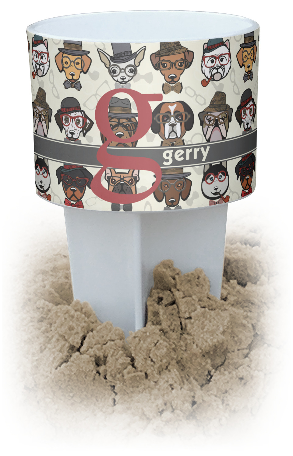 This cup holder has a large stake at its bottom that anchors it to the sand or ground below, while the cup holder rests above the stake. The entire drink holder is made of durable plastic and displays your customization around the cup holder portion. We sell these personalized beach spikers in two different colors: black and white.