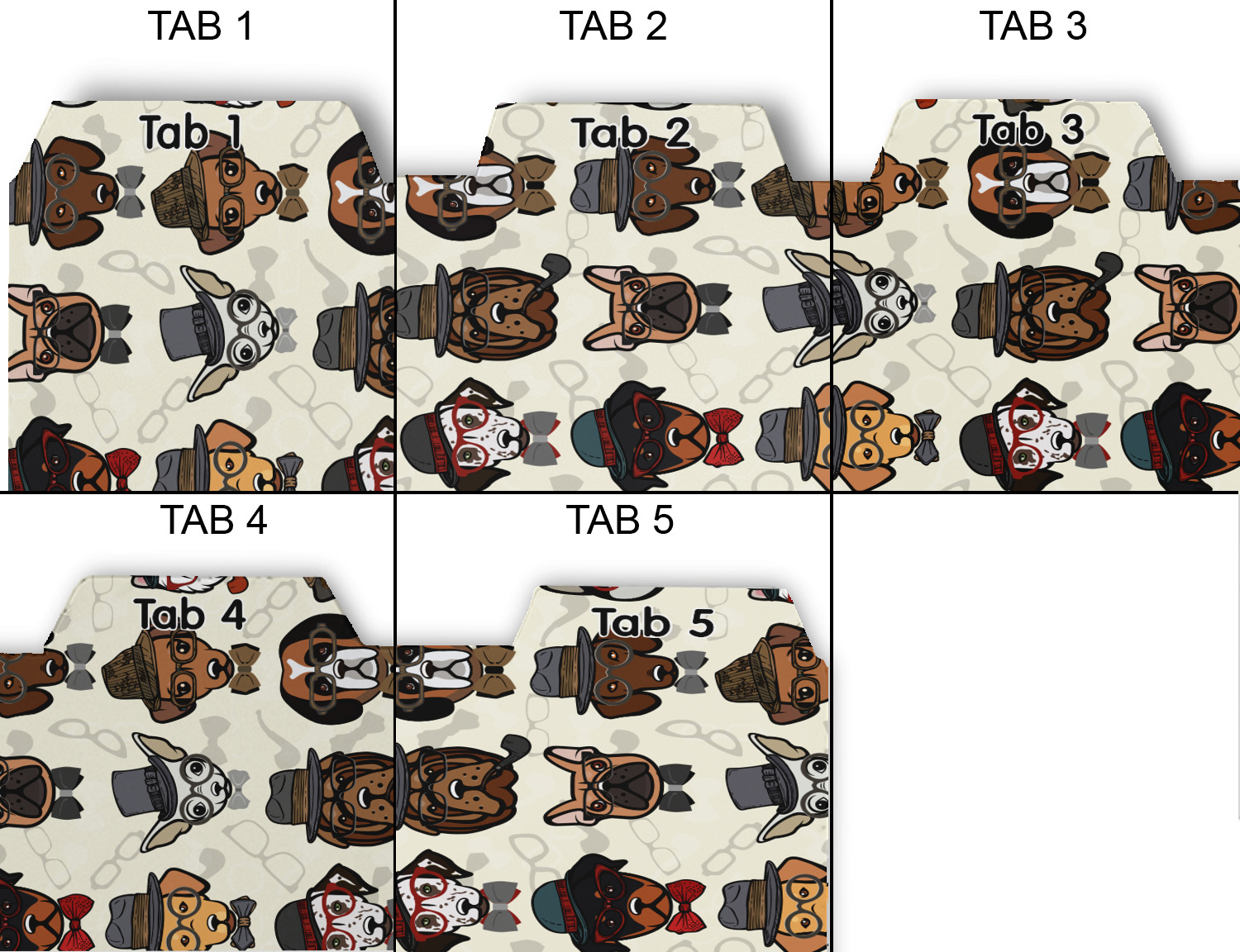 Whether you use binders at school or at work, we have designs to suit all of them. Available in 5 or 6 tab sets, you are sure to find a set to suit your needs. The back of each one is white and can be used to take notes, write vital information on, etc.