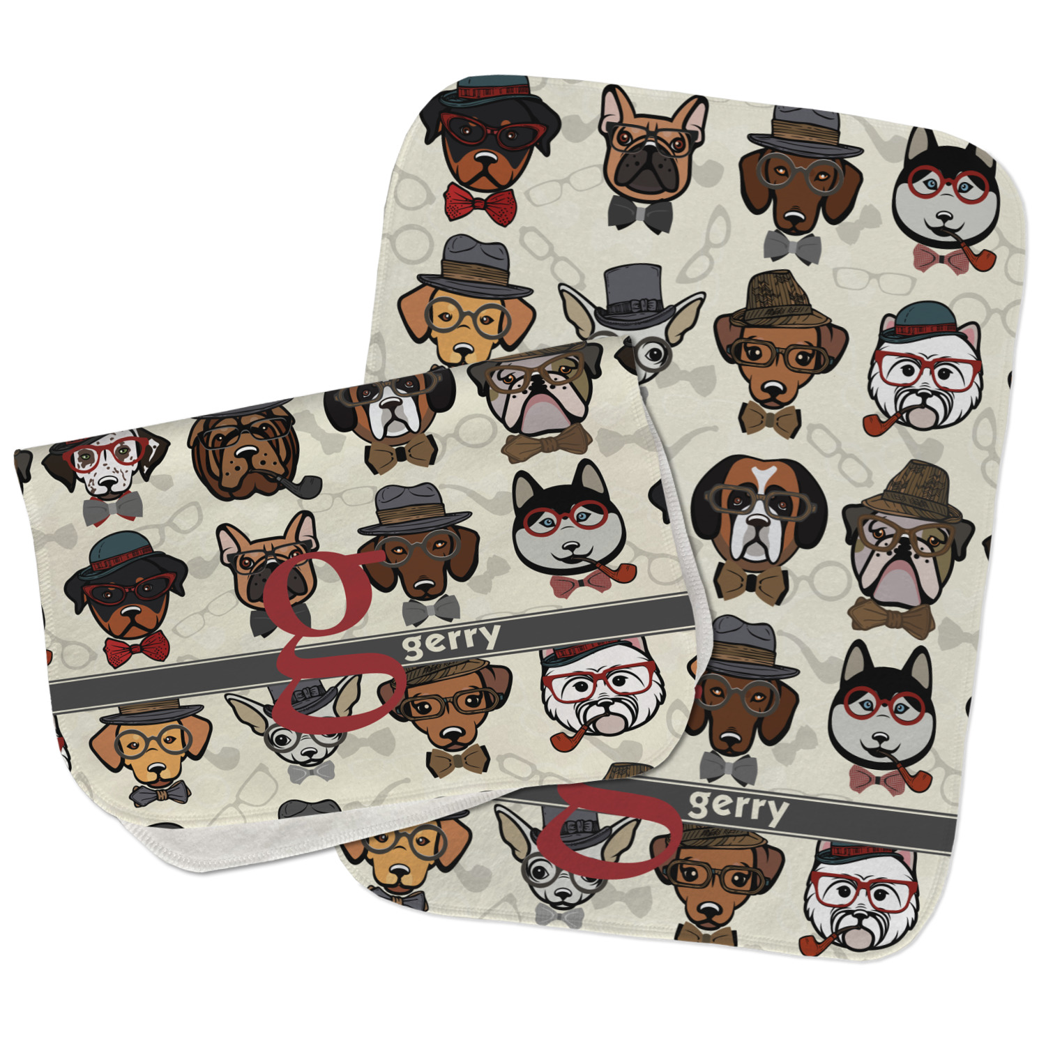 For design style, we chose the large initial and text on ribbon. We chose a dark grey ribbon, along with dark red for initial personalization color. For our coordinating design, we chose our tone on tone hipster design in the dark red. We think it turned out HIPSTER.