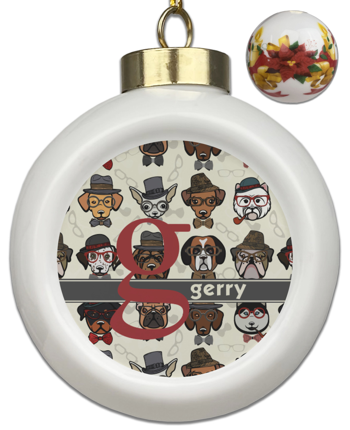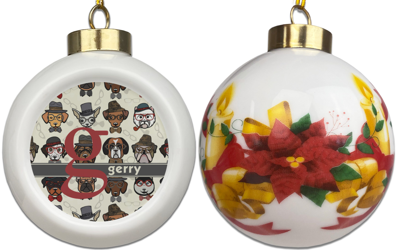 Our Christmas ornaments are a unique ceramic ball shape with a twist as it has a flat face to display your custom design! Select from one of our two design types - Christmas Tree or Poinsettia Garland - to adorn the curved back of your personal design. Each ornament measures 3H x 2.5W x 2D accompanied with a gold string accent for finishing touches to hang on your beautiful Christmas tree!
