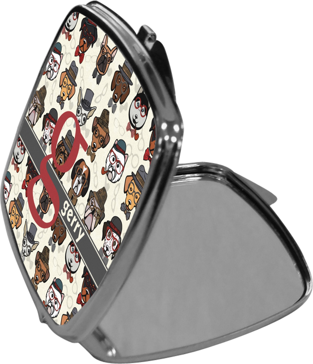 Our compact mirrors are customized with your design on one side. The other side is patterned silver tone metal. Inside, there are two mirrors.
