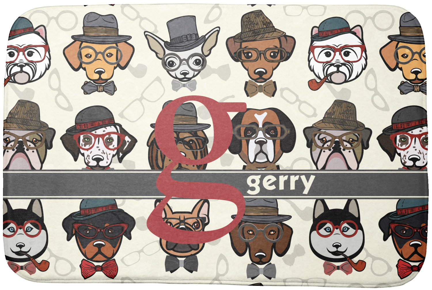 This hipster dogs design is a HIPSTER! We have faces of hipster dogs on a background of eyeglass frames, pipes and bowties. The background is re-color-able and so we chose a light cream background. The hipster dogs are wearing hats, glasses, wearing bow ties and some are smoking a pipe.
