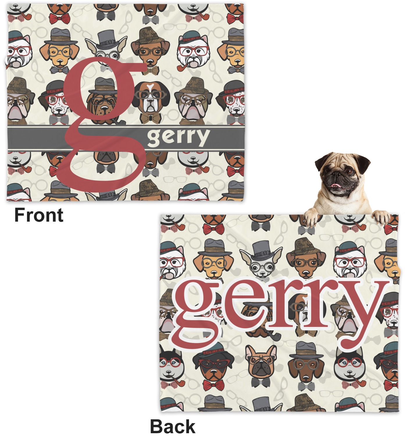 These dog blankets are crafted from a gentle, soft-to-the-touch, minky material. We print your customizations, either matching or differing, on both the top and underside of the blanket. These personalized dog blankets are available in two sizes: regular and large. Our regular size, at 40" x 30", accommodates small and some medium size dogs. At 60" x 50", our large dog blanket is a better fit for bigger breeds. Though specialized for dogs, these blankets still make a thoughtful gift for your favorite feline, or any other pet in mind!