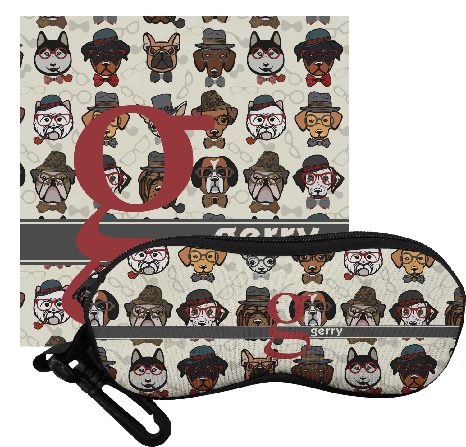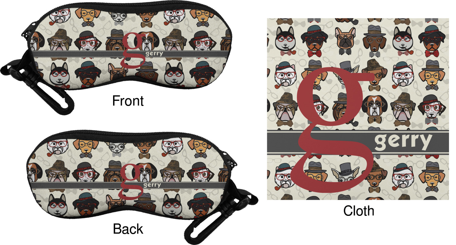 The cases have the design on both sides, a black zipper, and clips for hanging on a belt buckle or purse strap and also include matching lens cloths.
