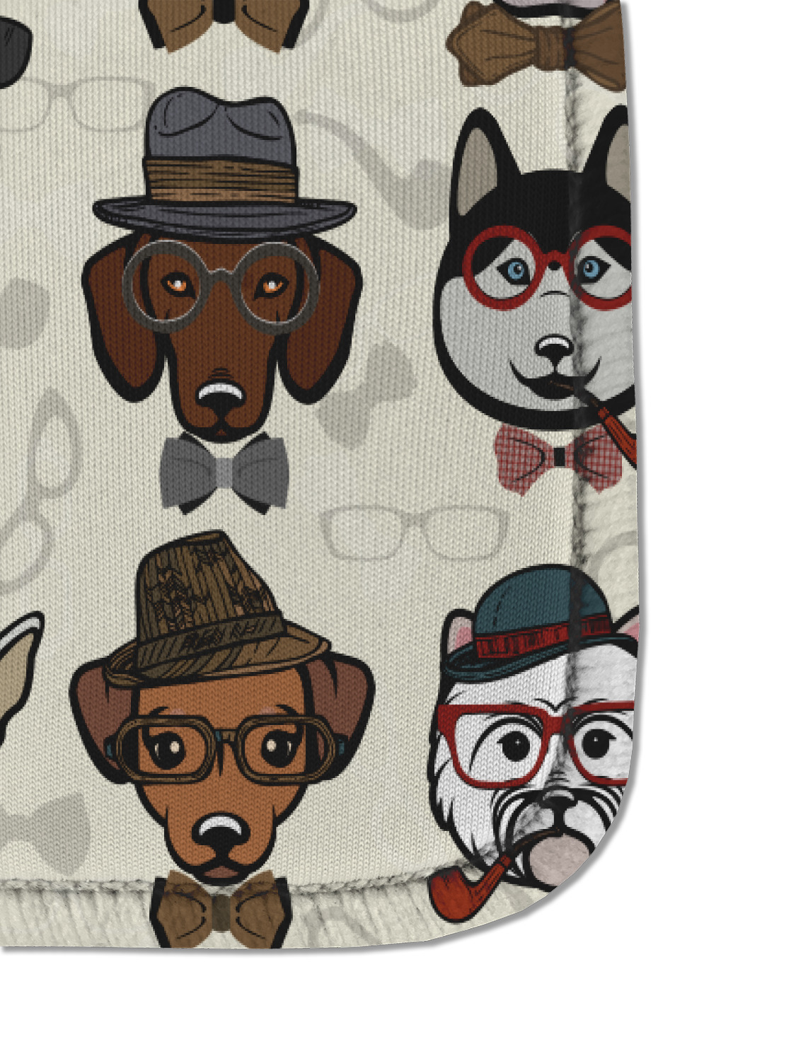 This hipster dogs design is a HIPSTER! We have faces of hipster dogs on a background of eyeglass frames, pipes and bowties. The background is re-color-able and so we chose a light cream background. The hipster dogs are wearing hats, glasses, wearing bow ties and some are smoking a pipe.