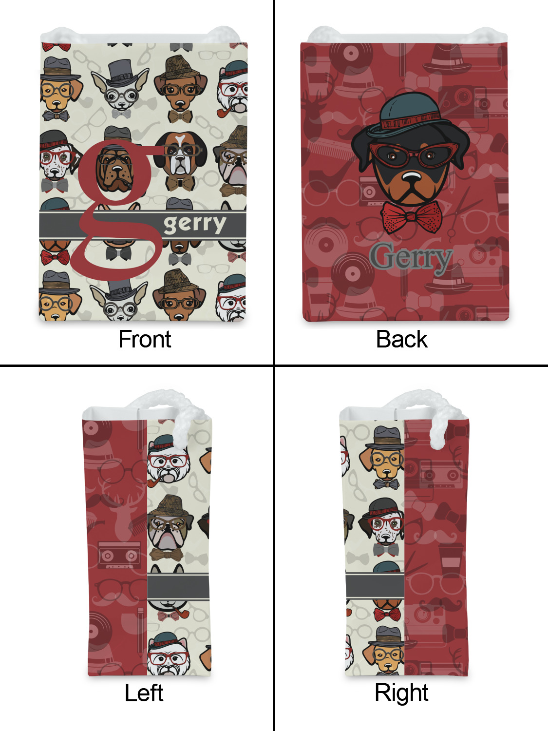 For design style, we chose the large initial and text on ribbon. We chose a dark grey ribbon, along with dark red for initial personalization color. For our coordinating design, we chose our tone on tone hipster design in the dark red. We think it turned out HIPSTER.