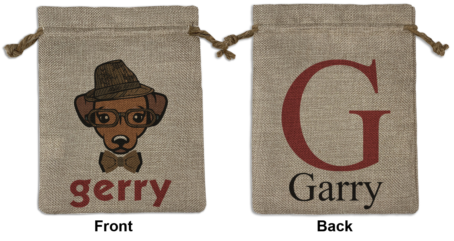 We sell our Burlap Gift Bags in 3 variant sized bags. Made with burlap polyester, each personalized bag can be secured with a twine drawstring pull. Your custom design is available to print on one side or both sides - completely up to you! The sizes of the bags measure approximately 4.5" x 6.5" for the smallest size, 6.5" x 8.0" for the medium size, and 6.5" x 13.5" for the large-sized bag.