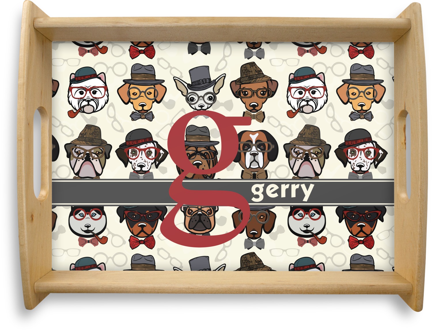 This serving tray with handles features square edges and two rounded sides, creating a very modern look. Each side is fabricated from a beautifully cut, natural wood. The bottom of the interior of the tray displays your customized design in bright, vibrant color. The tray is sold in both a black color and a natural wood look. Each variation of the wood serving tray has two sizes: Small, which is 14" x 10" x 2.25", and Large, which is 19.5" x 13.5" x 2.75".