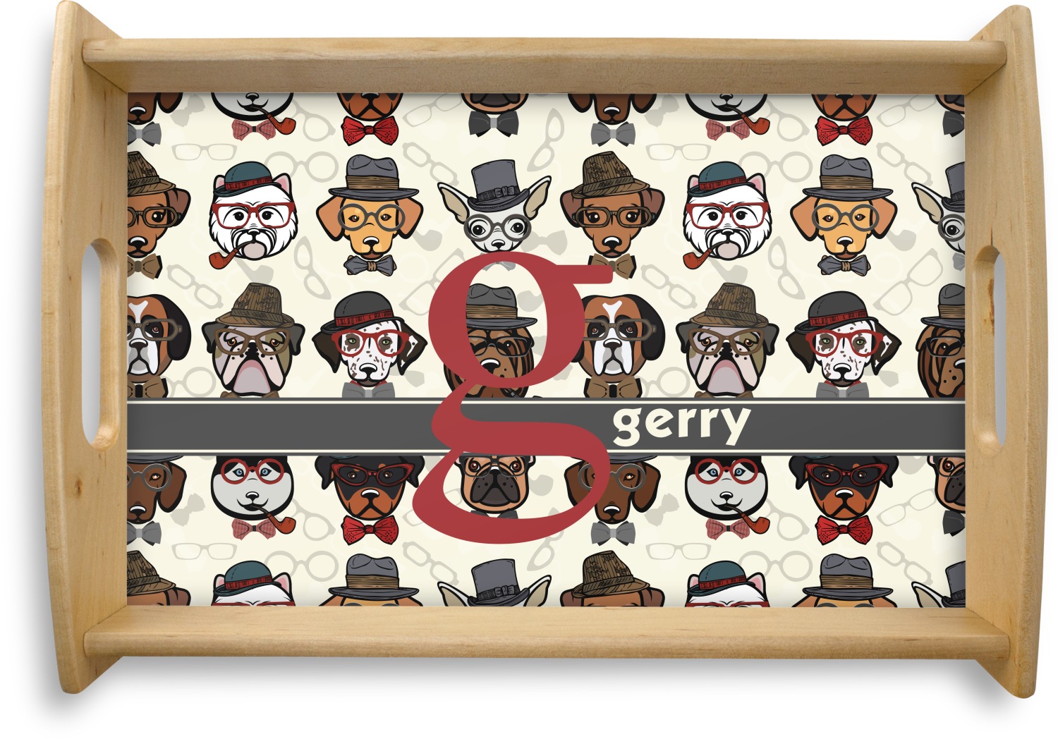 This serving tray with handles features square edges and two rounded sides, creating a very modern look. Each side is fabricated from a beautifully cut, natural wood. The bottom of the interior of the tray displays your customized design in bright, vibrant color. The tray is sold in both a black color and a natural wood look. Each variation of the wood serving tray has two sizes: Small, which is 14" x 10" x 2.25", and Large, which is 19.5" x 13.5" x 2.75".