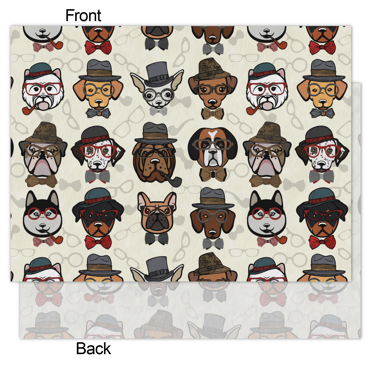 This hipster dogs design is a HIPSTER! We have faces of hipster dogs on a background of eyeglass frames, pipes and bowties. The background is re-color-able and so we chose a light cream background. The hipster dogs are wearing hats, glasses, wearing bow ties and some are smoking a pipe.