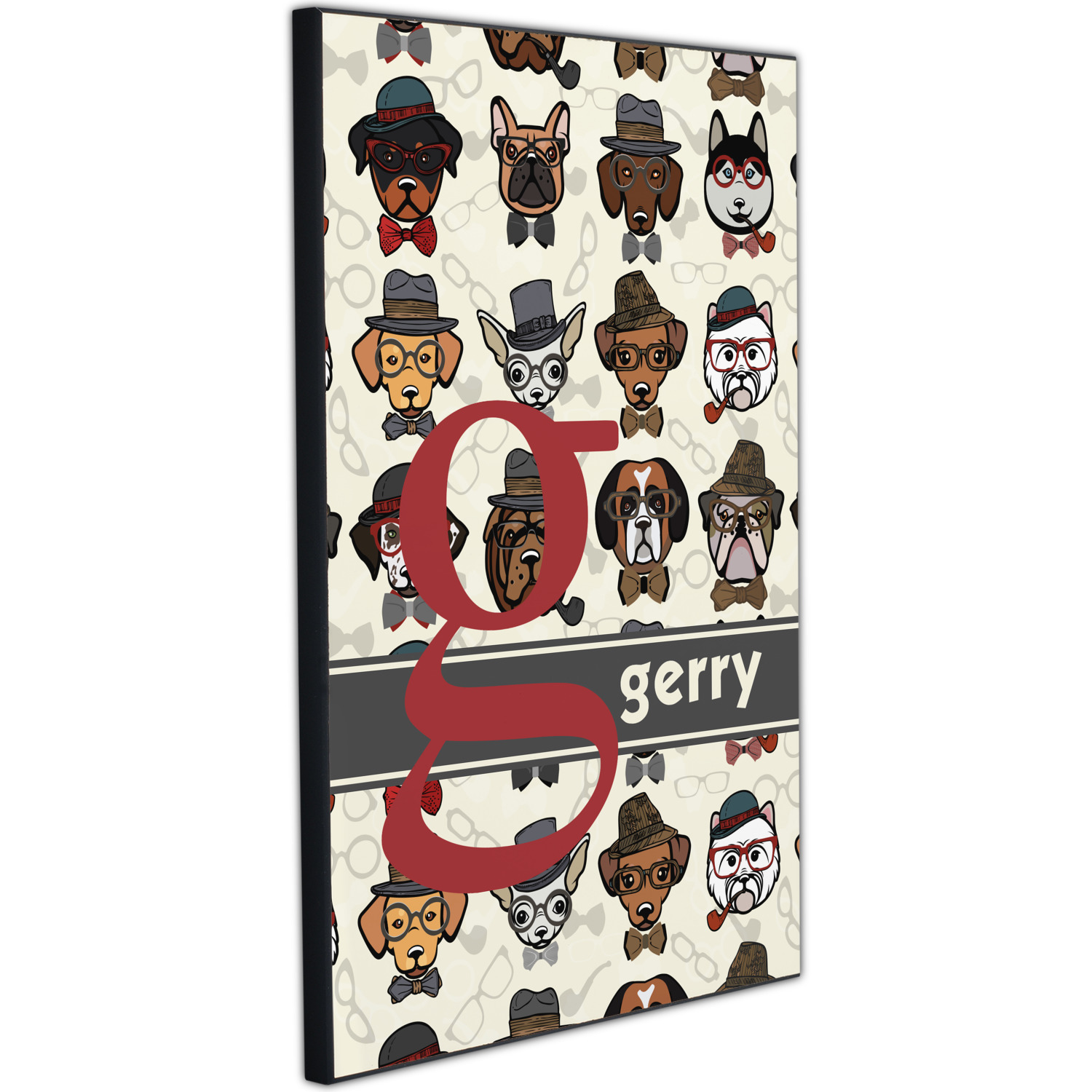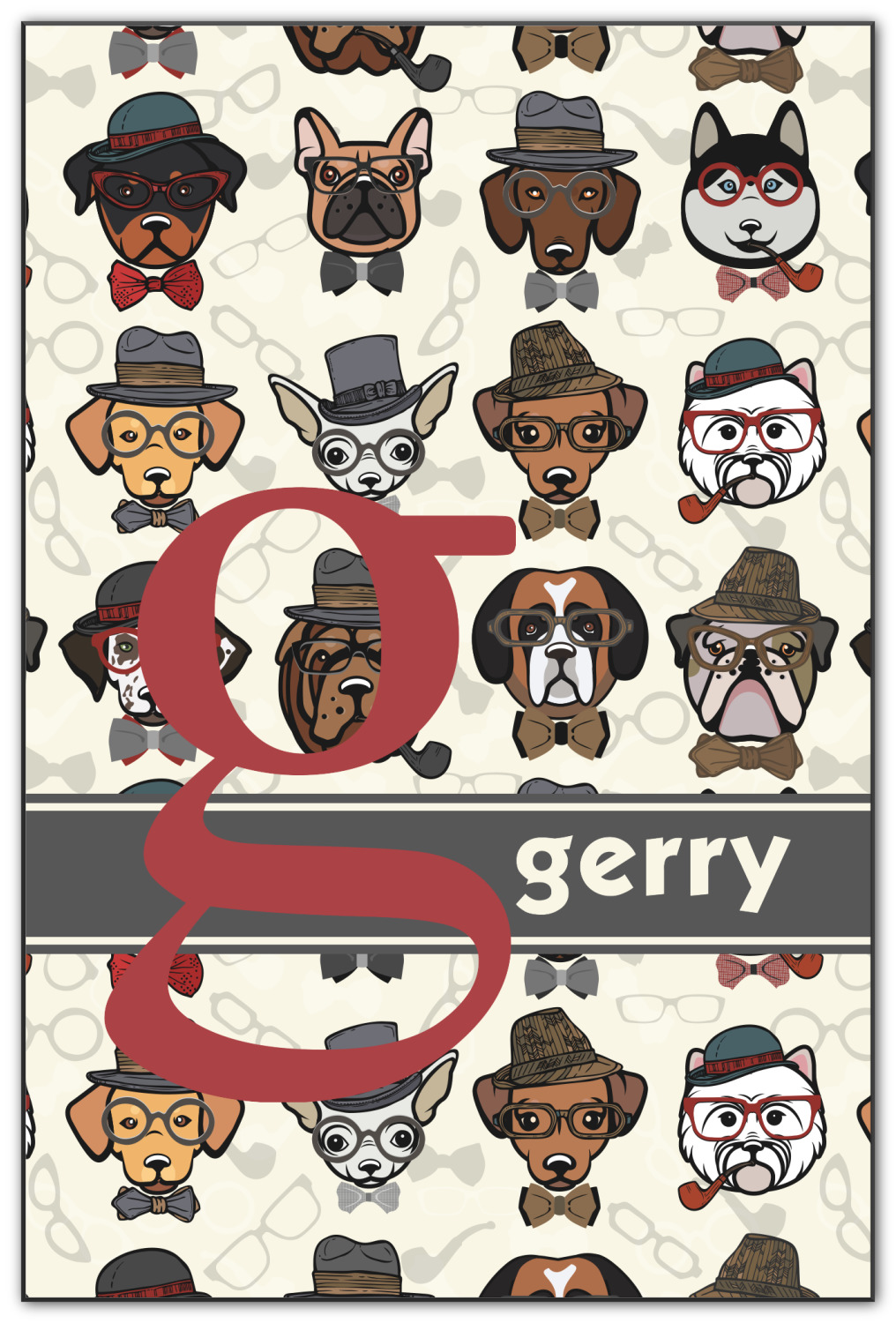 This hipster dogs design is a HIPSTER! We have faces of hipster dogs on a background of eyeglass frames, pipes and bowties. The background is re-color-able and so we chose a light cream background. The hipster dogs are wearing hats, glasses, wearing bow ties and some are smoking a pipe.