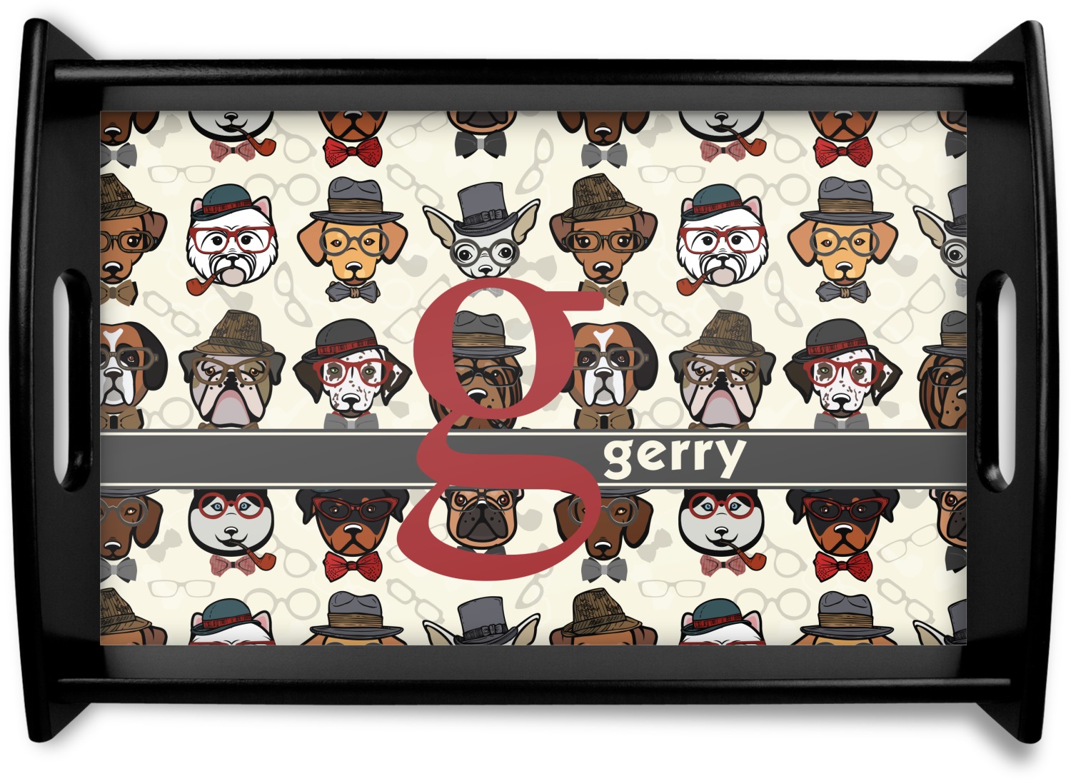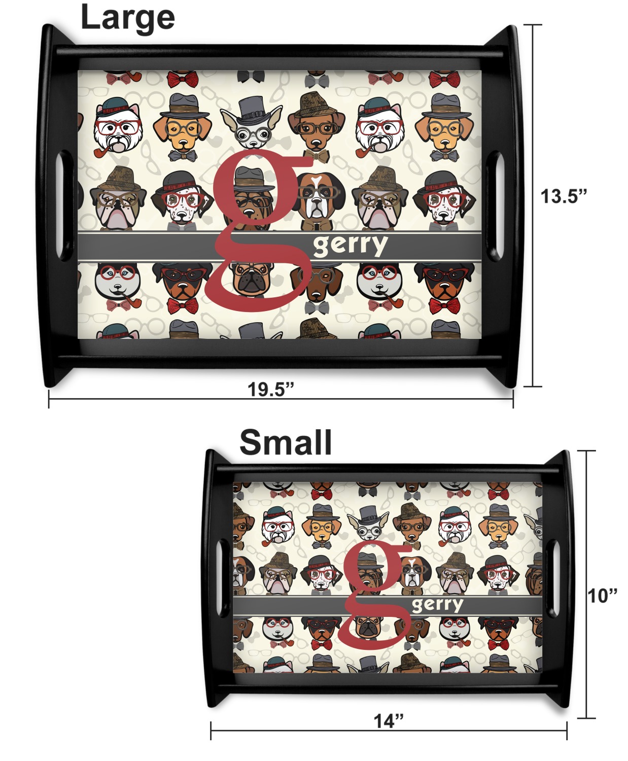 This serving tray with handles features square edges and two rounded sides, creating a very modern look. Each side is fabricated from a beautifully cut, natural wood. The bottom of the interior of the tray displays your customized design in bright, vibrant color. The tray is sold in both a black color and a natural wood look. Each variation of the wood serving tray has two sizes: Small, which is 14" x 10" x 2.25", and Large, which is 19.5" x 13.5" x 2.75".