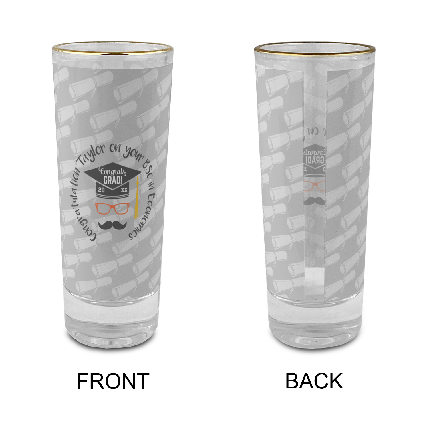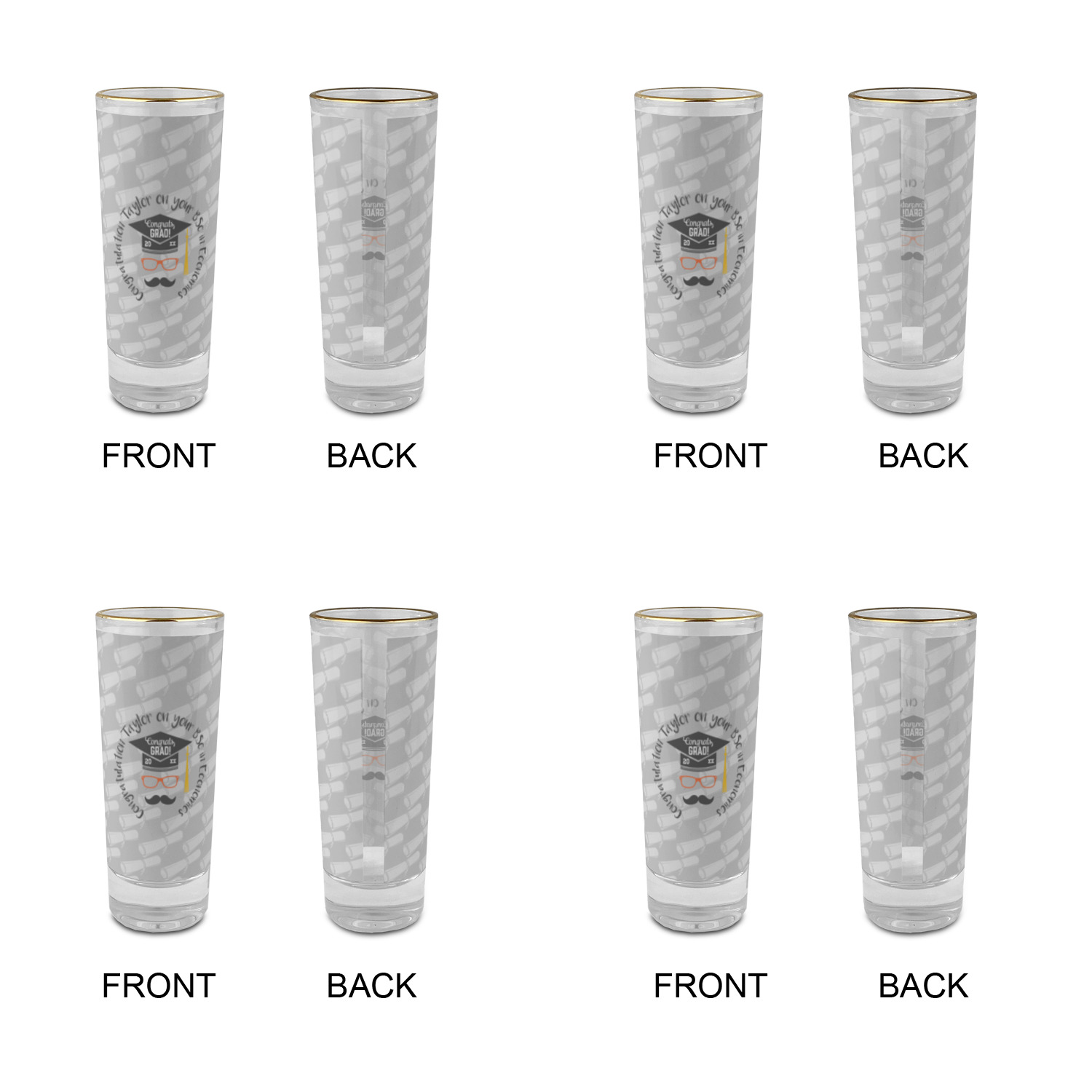 These glass shooter glasses are printed in full color with the design of your choice. These are a tall shooter 2 oz size and stand 4" tall. The print is a full wrap design to boldly display your personalization.