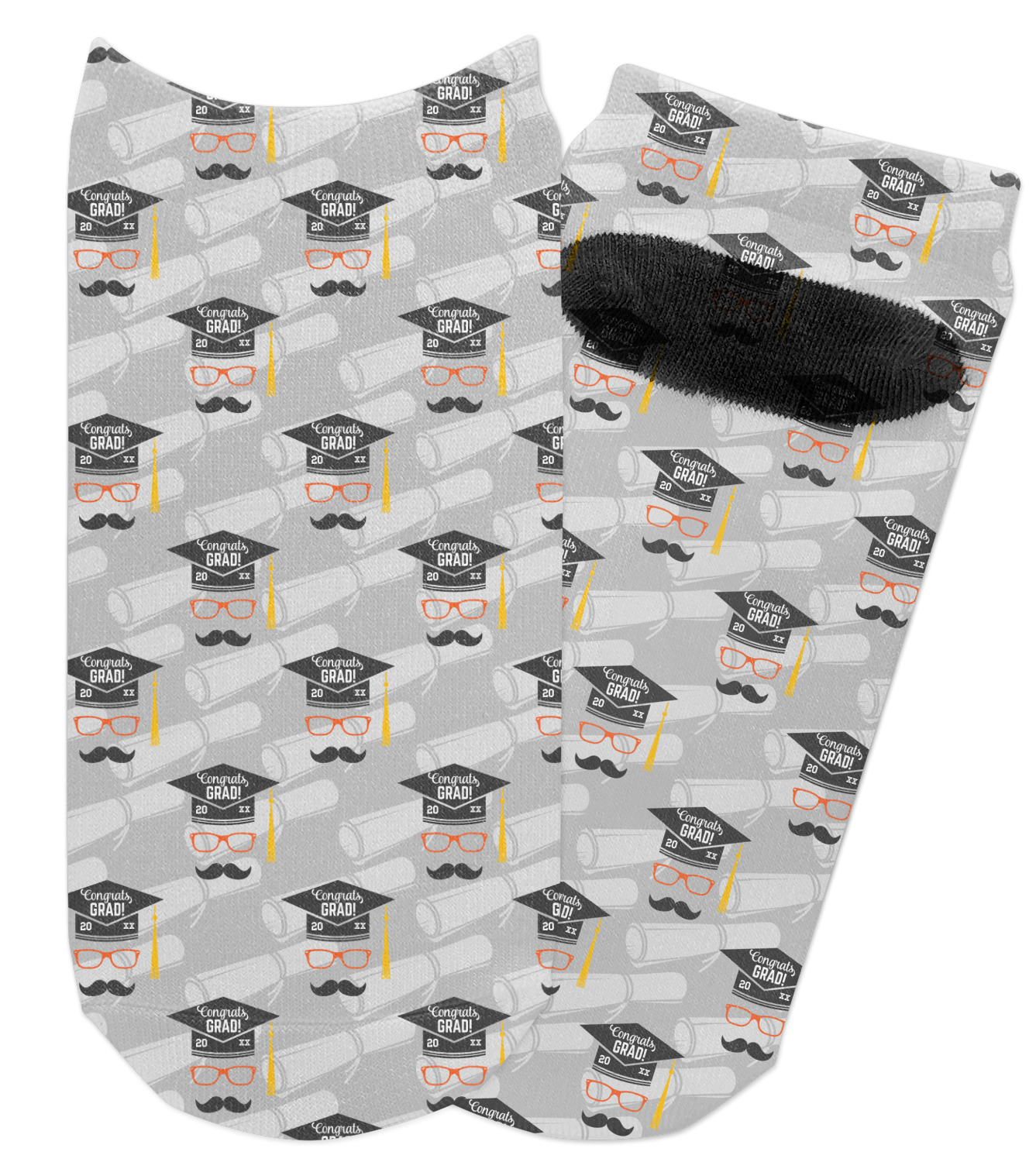 This whimsical and fun design makes the perfect graduation gift. We chose a tone on tone background with graduation scrolls and chose a light grey color. We chose graphic with circular text for our personalization style; change the text to suit your graduate. Customize the colors in the hipster graphic including the glasses, tassel and mustache color. We have other graduate backgrounds as well as graduate graphic in our system. So go ahead and change things to suit your graduate.