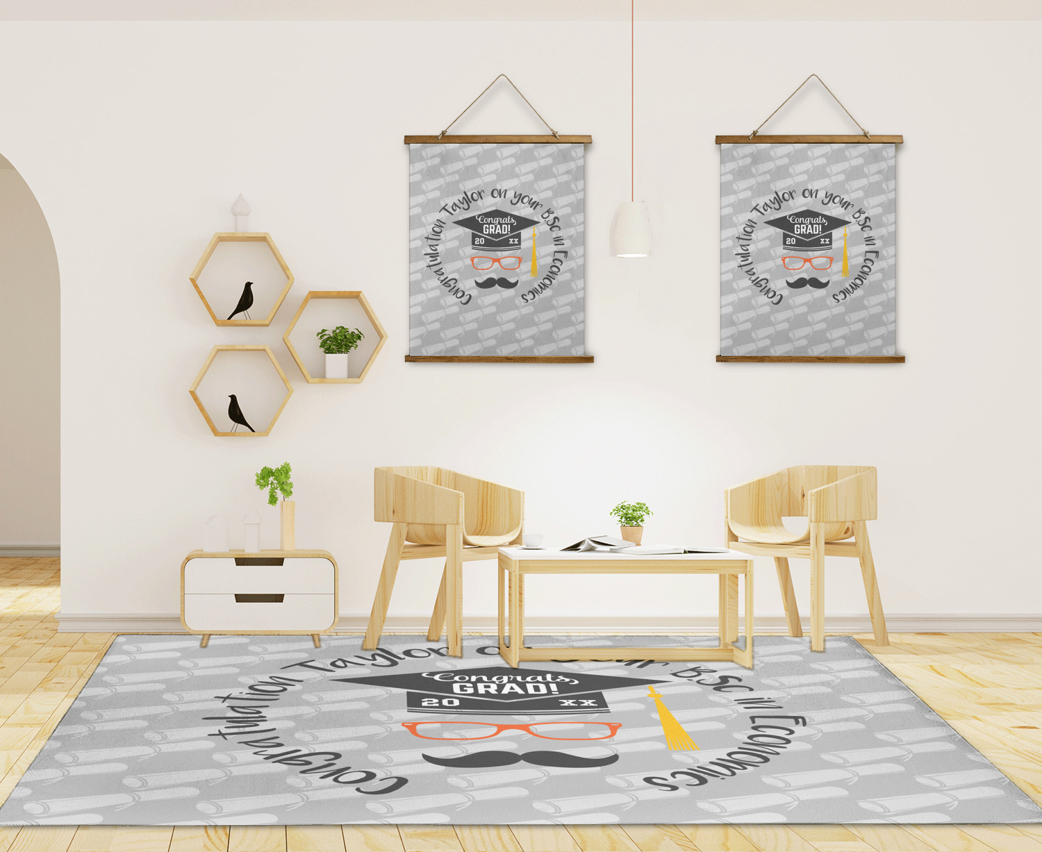This whimsical and fun design makes the perfect graduation gift. We chose a tone on tone background with graduation scrolls and chose a light grey color. We chose graphic with circular text for our personalization style; change the text to suit your graduate. Customize the colors in the hipster graphic including the glasses, tassel and mustache color. We have other graduate backgrounds as well as graduate graphic in our system. So go ahead and change things to suit your graduate.