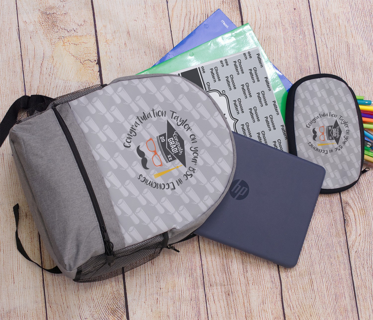 This whimsical and fun design makes the perfect graduation gift. We chose a tone on tone background with graduation scrolls and chose a light grey color. We chose graphic with circular text for our personalization style; change the text to suit your graduate. Customize the colors in the hipster graphic including the glasses, tassel and mustache color. We have other graduate backgrounds as well as graduate graphic in our system. So go ahead and change things to suit your graduate.