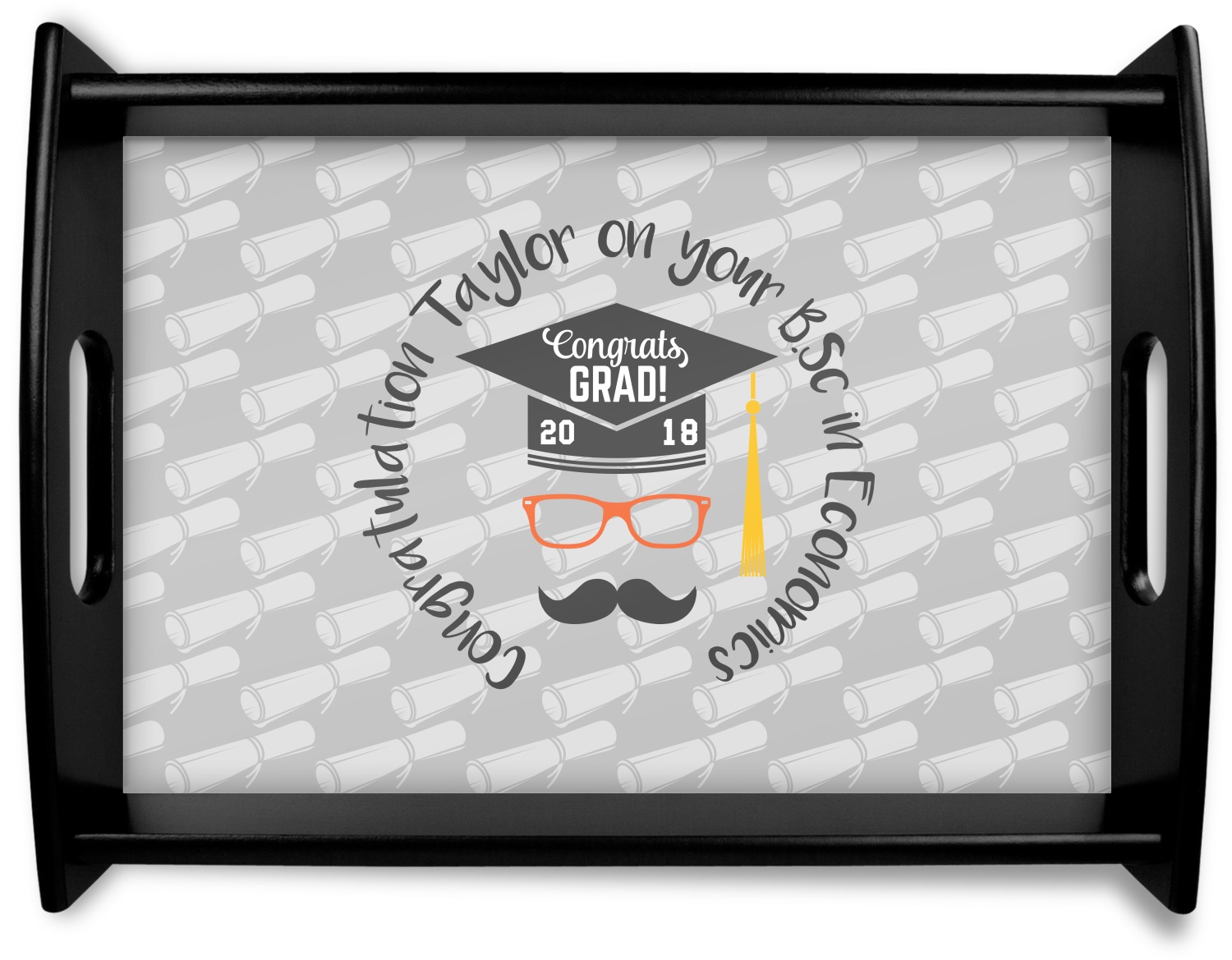 This whimsical and fun design makes the perfect graduation gift. We chose a tone on tone background with graduation scrolls and chose a light grey color. We chose graphic with circular text for our personalization style; change the text to suit your graduate. Customize the colors in the hipster graphic including the glasses, tassel and mustache color. We have other graduate backgrounds as well as graduate graphic in our system. So go ahead and change things to suit your graduate.